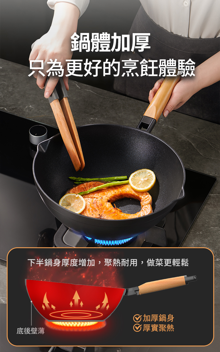 與傳統鍋的等高邊不同,採非均衡設計,拋甩食材時順著鍋型,