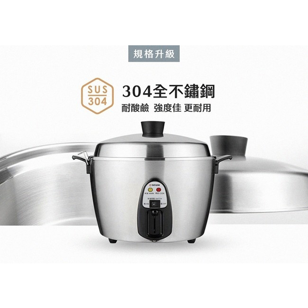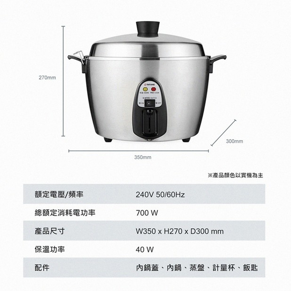 ◆消費權益◆■ 鑑賞期並非"試用期"。■ 退貨商品需是「全新商品」且「包裝完整」,包括外箱、包材、贈品等原廠所有配件,缺件、刮傷皆不同意退換貨。■ 大型家電一經拆箱定位安裝、插電及使用後,除原廠鑑定為商品問題外,不得以其他個人理由退換貨。■ 商品簽收前請務必確認商品型號、顏色正確,一經簽收即代表同意,不得以其他個人理由退換貨。■ 對商品有疑慮的地方請務必先詢問,能接受再訂購!■ 商品送達後若因買家因素無法安裝或拒收,買家需負擔賣家出貨產生的物流費用商品特色:. 鍋蓋、內鍋、內鍋蓋、蒸盤 均為SUS 304不鏽鋼材質. 具保溫切換裝置,免拔插頭. 雙重被覆電源線,雙重安全保護. 煮飯/粥、蒸、滷、燉多用途. 符合BSMI 240V電壓插頭商品規格:型號:TAC-11T-MMV4容量:11人份電壓:240V 50/60Hz總額定消耗電功率:700W保溫功率:40W尺寸:350 * 270 * 300 mm重量:4.2kg能源分級:3級產地:台灣保固:1年BSMI:R31001貨源:公司貨※此機型有保溫開關,電源線與主體為連接式※異電壓電鍋“僅符合當地電壓使用,請自行另購買當地的轉換插頭使用”※異電壓商品保固、維修、退貨相關辦法僅限於台灣本島不適用國外※本商品資訊由網路及官網收集彙整而成,僅供參考,如有更新或異動不另外通知,正確商品資訊及規格以實機為準。鑑賞期非試用期,產品一經拆箱、插電及使用皆會影響您退貨權利並酌收整新費用。