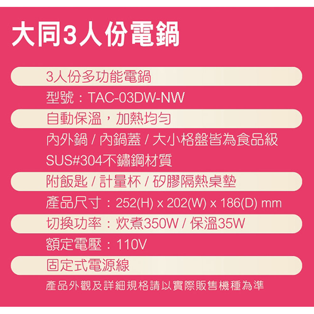 ◆消費權益◆■ 鑑賞期並非"試用期"。■ 退貨商品需是「全新商品」且「包裝完整」,包括外箱、包材、贈品等原廠所有配件,缺件、刮傷皆不同意退換貨。■ 大型家電一經拆箱定位安裝、插電及使用後,除原廠鑑定為商品問題外,不得以其他個人理由退換貨。■ 商品簽收前請務必確認商品型號、顏色正確,一經簽收即代表同意,不得以其他個人理由退換貨。■ 對商品有疑慮的地方請務必先詢問,能接受再訂購!■ 商品送達後若因買家因素無法安裝或拒收,買家需負擔賣家出貨產生的物流費用商品特色:‧時尚美型珍珠白外觀‧內鍋便當盒設計,居家/隨行多功使用‧簡易單鍵操作‧隔熱提把設計商品規格:型號:TAC-03DW-NW容量:3人份電壓:110V / 60Hz尺寸:252 * 202 * 186 mm重量:3.3kg能源分級:5級產地:台灣保固:1年BSMI:R31001貨源:公司貨本商品資訊由網路及官網收集彙整而成,僅供參考,如有更新或異動不另外通知,正確商品資訊及規格以實機為準。鑑賞期非試用期,產品一經使用皆會影響您退貨權利。