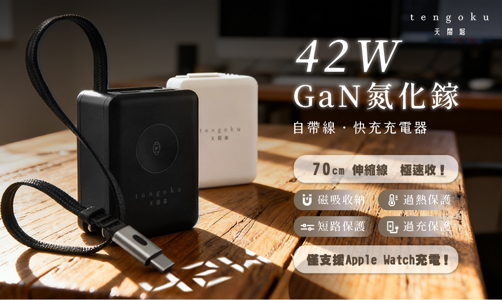 【tengoku天閤堀】42W氮化鎵四合一雙孔自帶伸縮線快充充電器