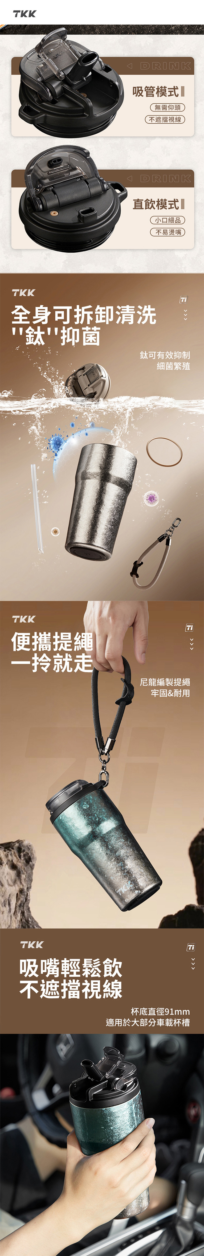 【TKK】洛奇系列 純鈦Ti 咖啡杯 保溫杯 隨身杯 630ML(提繩+直飲+吸管)-鈦金屬