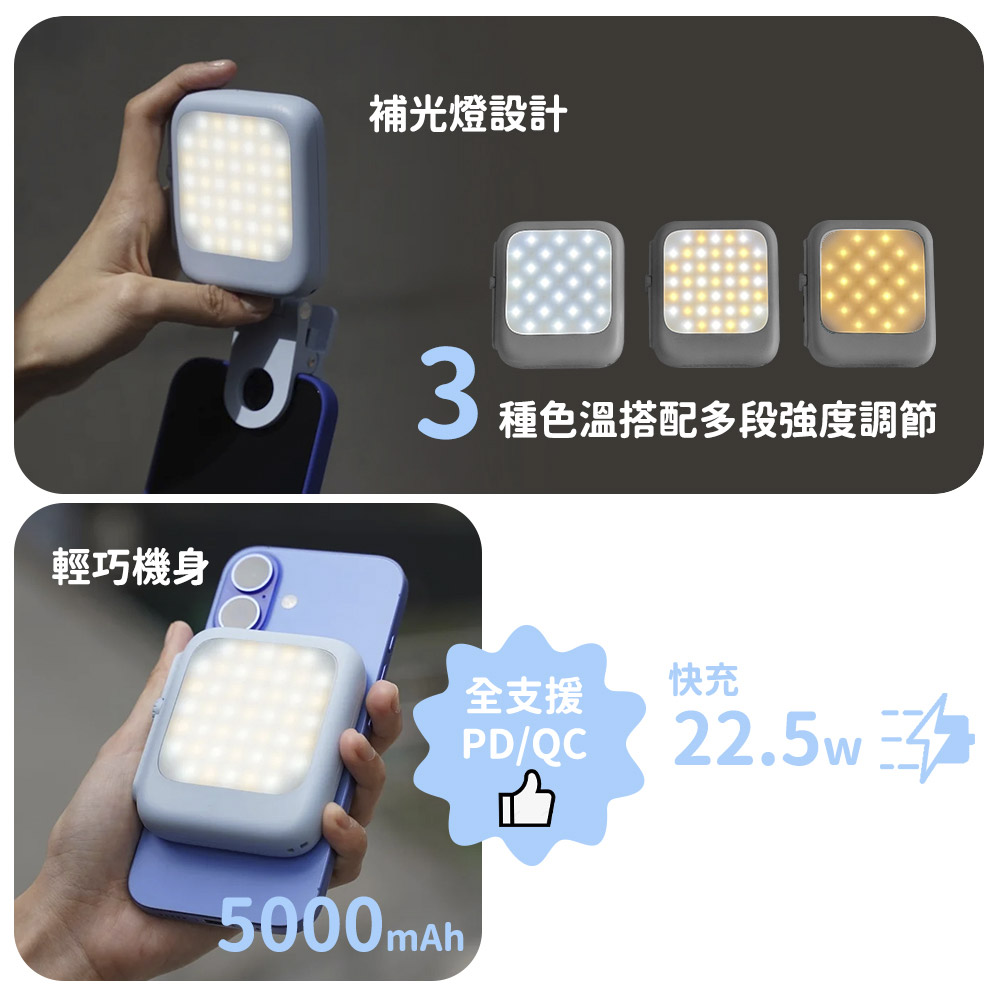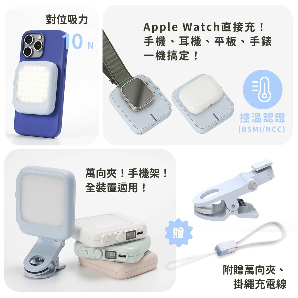 ● 補光燈設計,3種色溫搭配● 附贈萬向夾、掛繩充電線● Apple Watch直接充!● 七重安全保護機制◎充電頭與手機快充瓦數必須高於門檻◎指環支架及厚型手機殼不適用,或改用附磁吸功能之手機殼。◎無磁吸功能之手機請另行購買磁吸貼片,或附磁吸功能之手機殼。