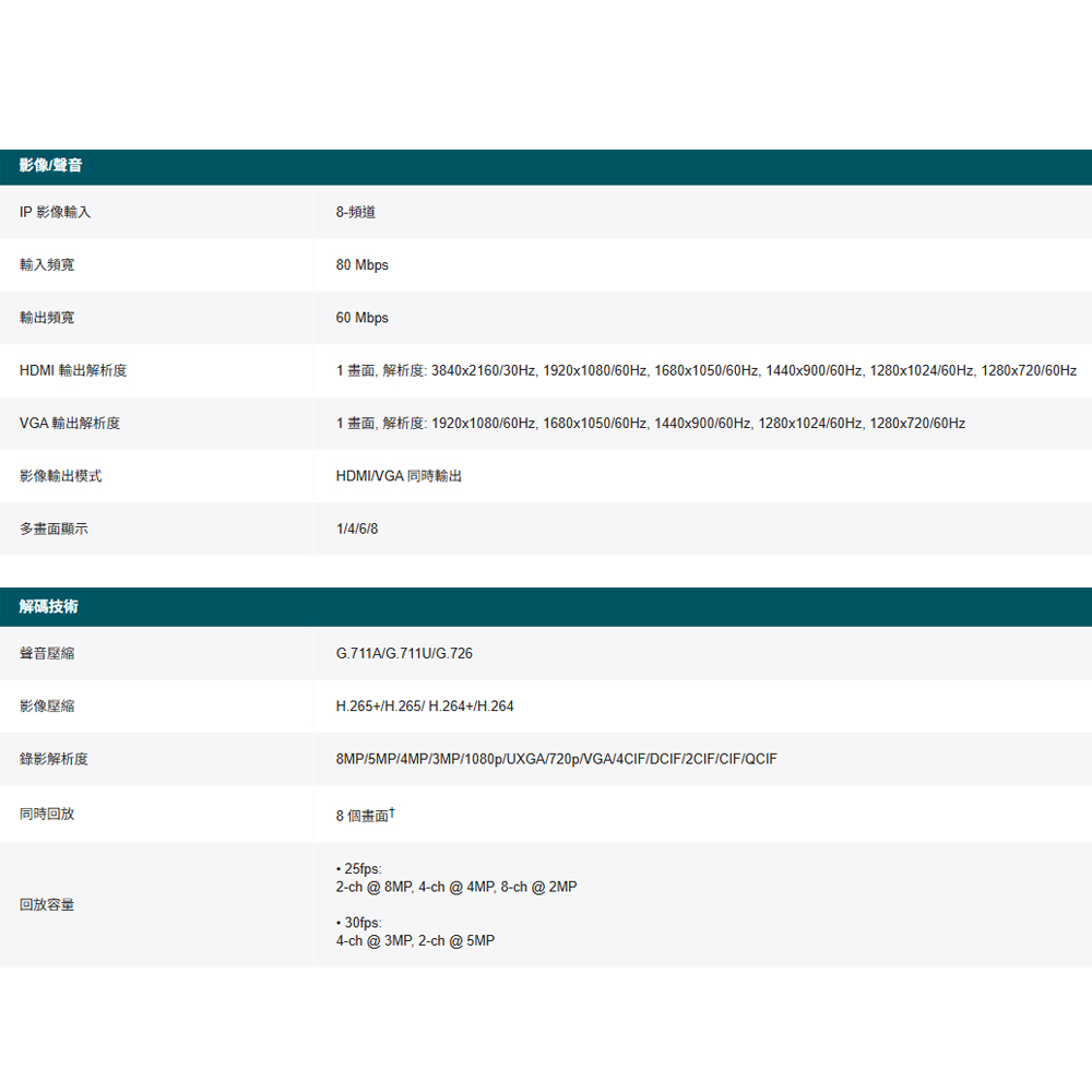 高達 8 路 @ 2MP (25fps) / 4 路 @ 4MP (25fps) 解碼能力