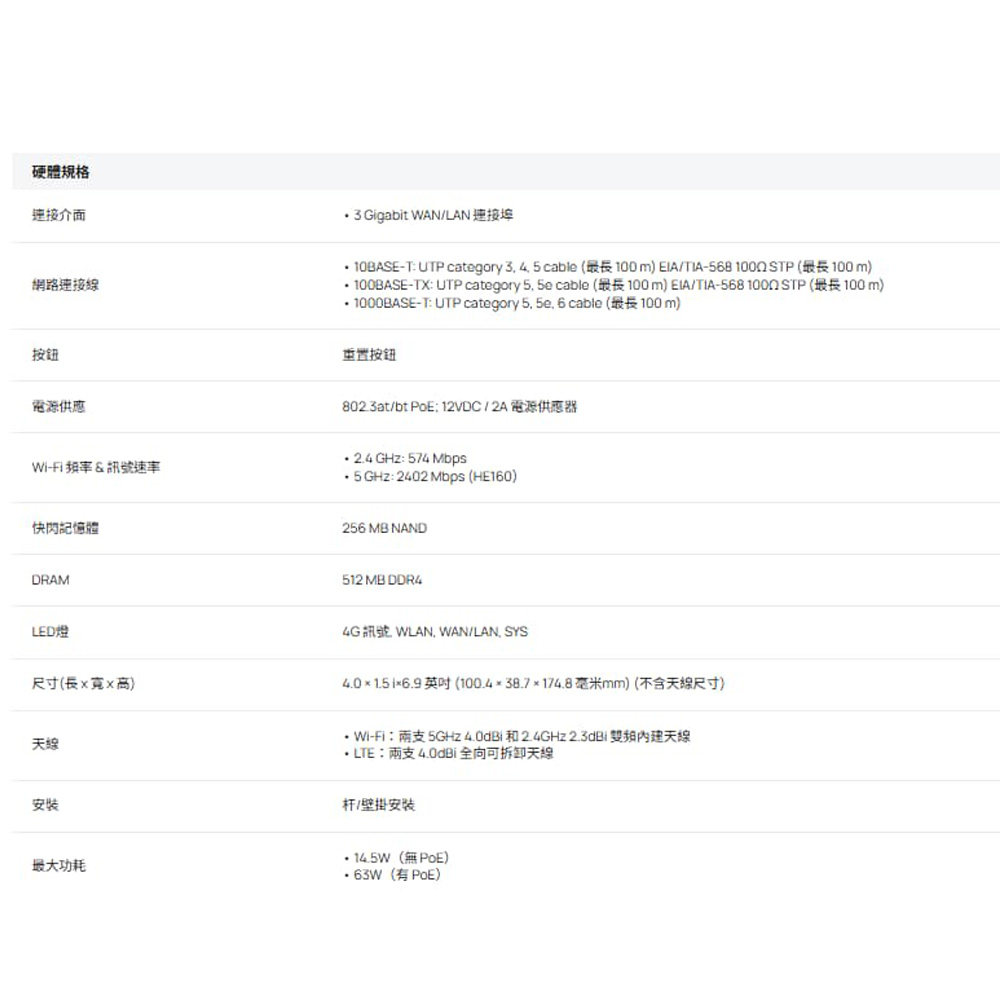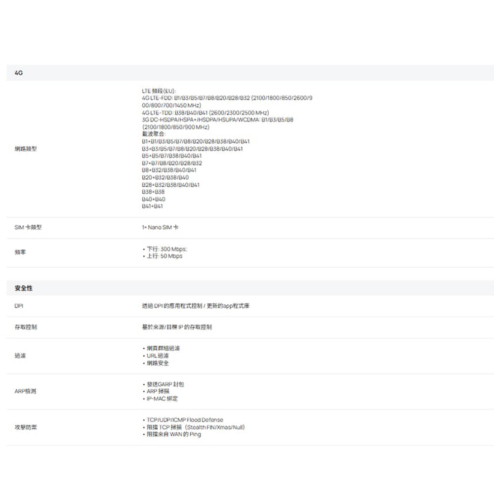 • 4G+ Cat6 高達 300 Mbps。