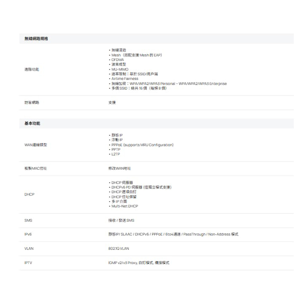 • AX3000 Wi-Fi 6提供在5GHz頻段的2402 Mbps速度和在2.4GHz頻段的574 Mbps速度。