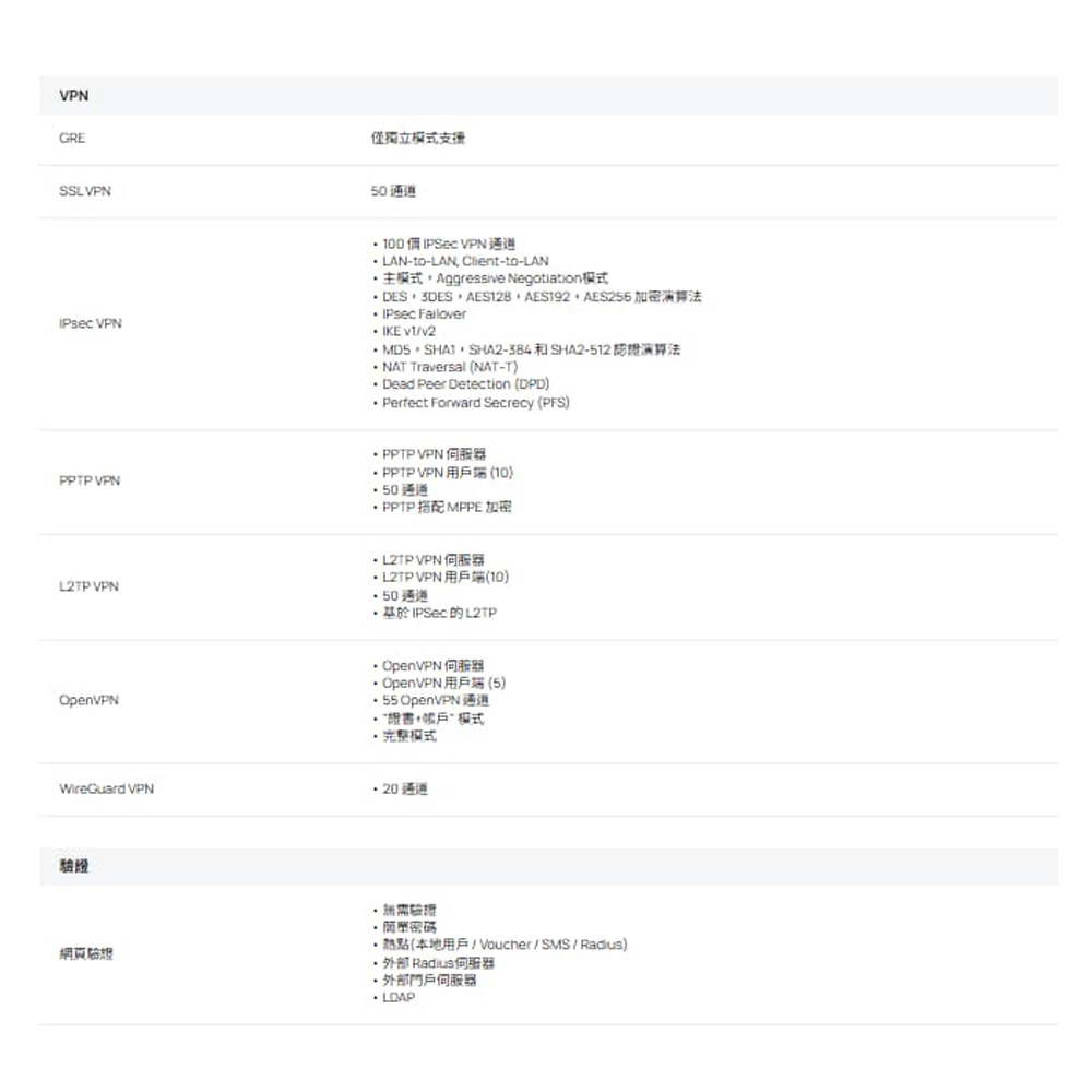 • IPSec/L2TP/PPTP/OpenVPN/GRE/WireGuard/SSL VPN§