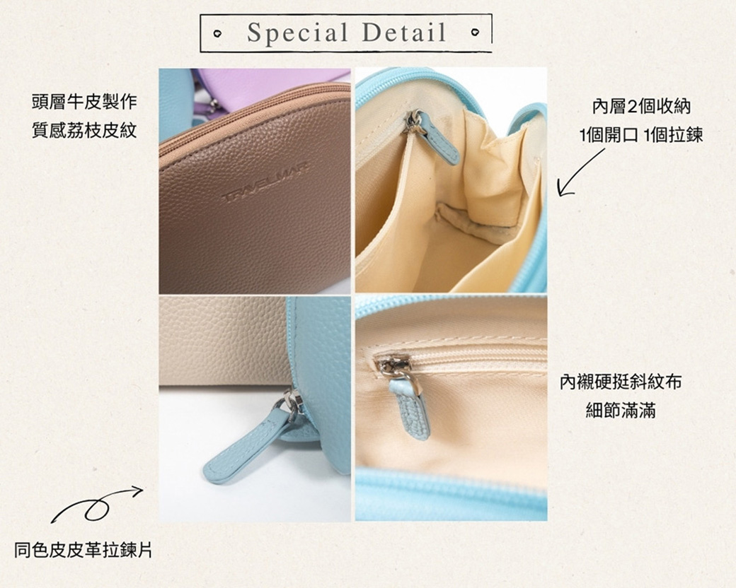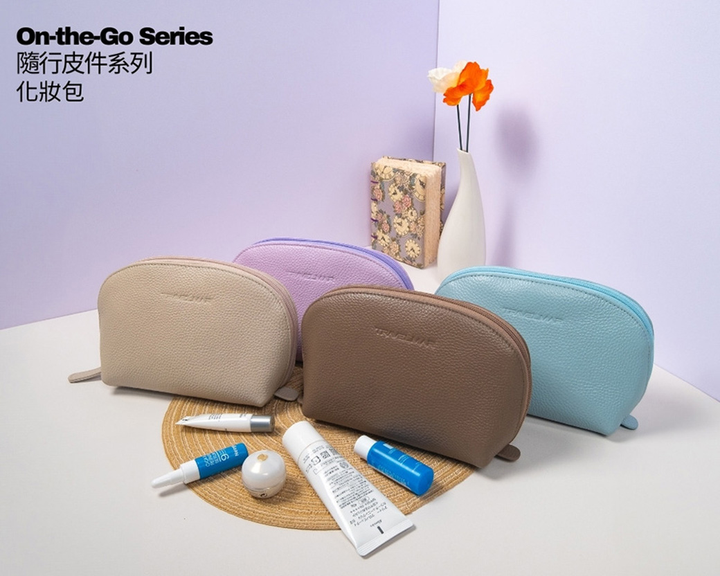 ➤ 選用真皮(牛皮),觸感細膩、風格質感。➤ 貼心收納: 內部設有 1個貼袋 與 1個拉鍊袋,方便分類唇膏、粉餅等小物。➤ 輕量規格: 重量僅 110g,輕巧好攜帶