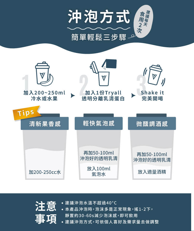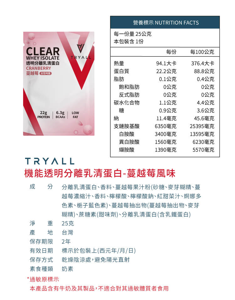 🔹每份含80%以上的蛋白質,奶素可食🔹透明分離乳清基底,減少糖分與熱量的攝取🔹三款機能系列→ 芭樂檸檬、檸檬紅茶、蔓越莓