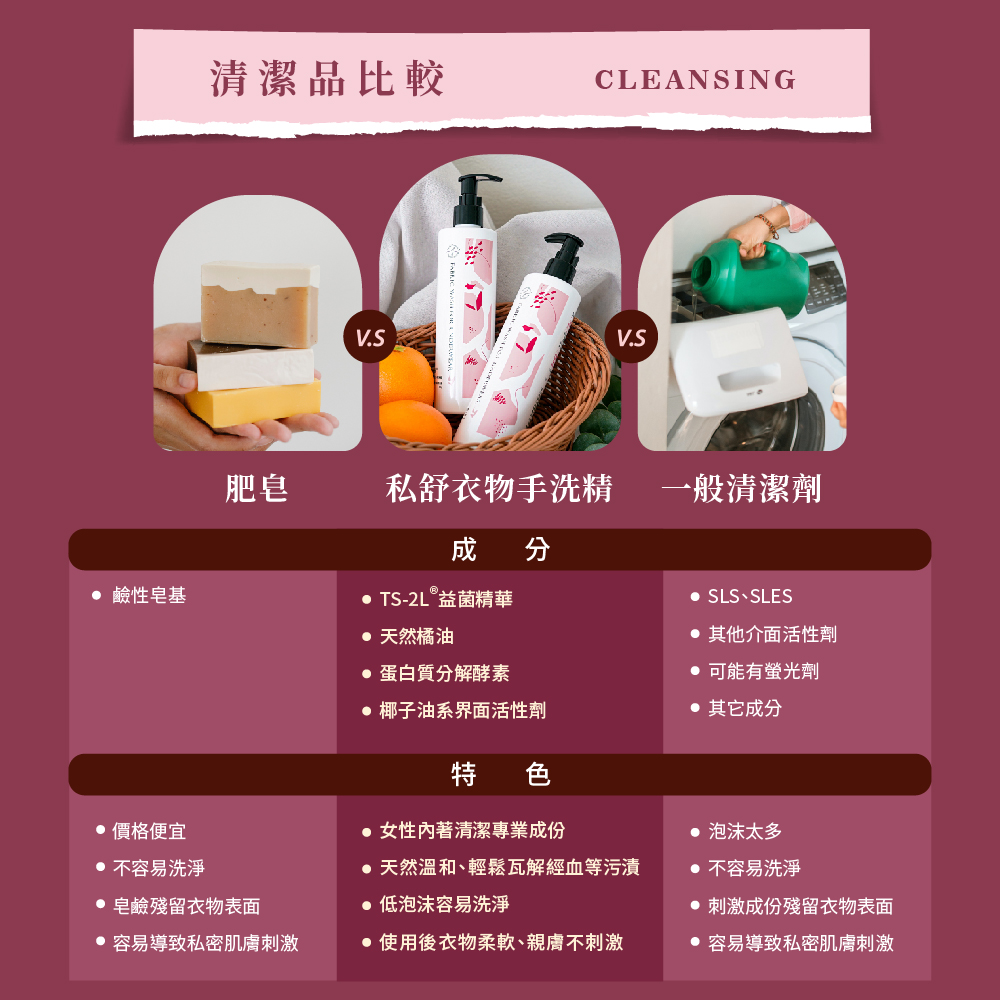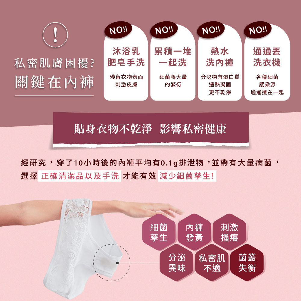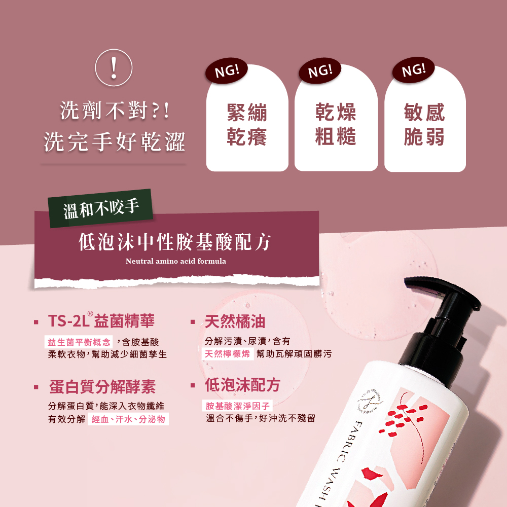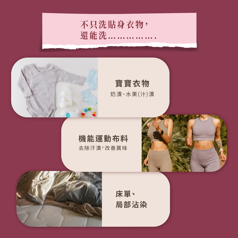 ※內含蛋白質分解酵素成分,如為純蠶絲內衣褲,為避免變形,不建議使用。