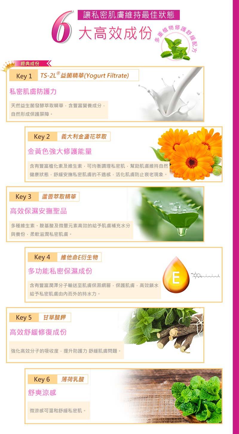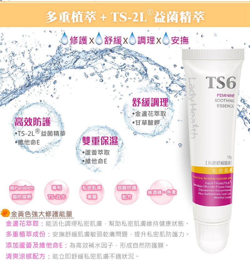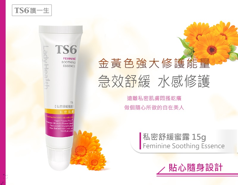 TS6 私密舒緩蜜露■產品規格:15g■產品成份:TS-2L優菌精華、金盞花萃取、蘆薈萃取、甘草酸鉀、維他命E、薄荷乳酸、精胺酸■適用時機:私密肌膚摩擦刺激時、私密肌膚乾癢不適時、私密肌膚一般除毛後、更年期乾澀不適。■使用方法:私密肌膚擦拭清潔後(可搭配TS6護一生柔濕巾),取適量塗抹於私密肌膚,待自然吸收即可,亦可天天使用。■保存方式:請置於陰涼乾燥通風處,避免高溫及日光直接照射。■保存期限:3年■注意事項:使用後若有異狀,請立即停用,並洽詢專業人士。■生產地:台灣