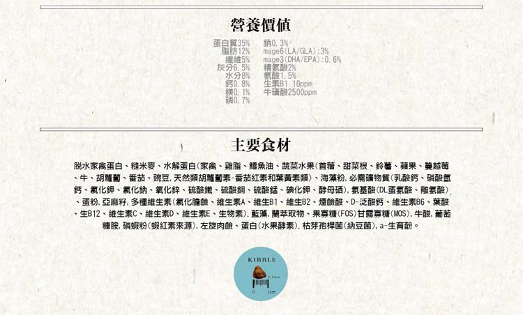 產地 台灣主要原料:脫水家禽蛋白,糙米,燕麥,水解蛋白(家禽),禽脂,鱈魚油,蔬菜和水果(苜蓿、甜菜根、馬鈴薯、蘋果、蔓越莓、牛蒡、胡蘿蔔、番茄、豌豆),必需礦物質,蛋粉,多種維生素,絲蘭萃取物,果寡糖(FOS),甘露寡糖(MOS),牛磺酸,葡萄糖胺,L左旋肉堿,蛋白(水果酵素),枯草芽孢桿菌,α-生育酚。營養價值:蛋白質35%,脂肪12%,灰分6.5%,纖維5.0%,水分8.0%,鈣0.8%,磷0.7%,鈉0.2%,Ω6 3.0%,Ω3 0.6%,賴氨酸1.5%,維生素B1 10ppm,牛磺酸2500ppm卡路里(ME):3450Kcal/KG保存期限 18個月重量(kg) 10kg保存方式 避免放置潮濕處 、 避免放置太陽照射處 、 請儘快食用完畢鑑賞期並非試用期,本商品一經拆封使用,恕無法辦理退貨,退貨的商品必須為全新狀態且完正包裝,敬請見諒,商品請以實體為主 。