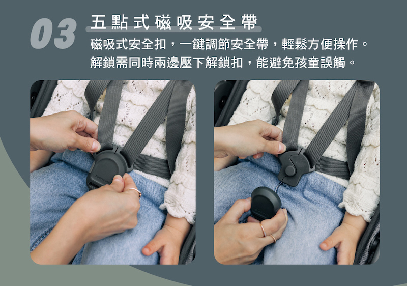 ●五點式安全帶升級 磁吸式安全扣,一鍵調節安全帶,輕鬆方便操作。
