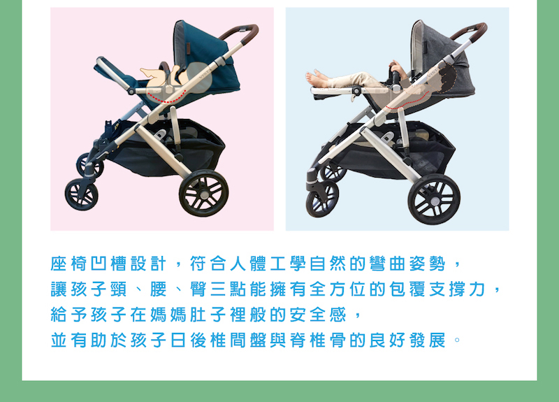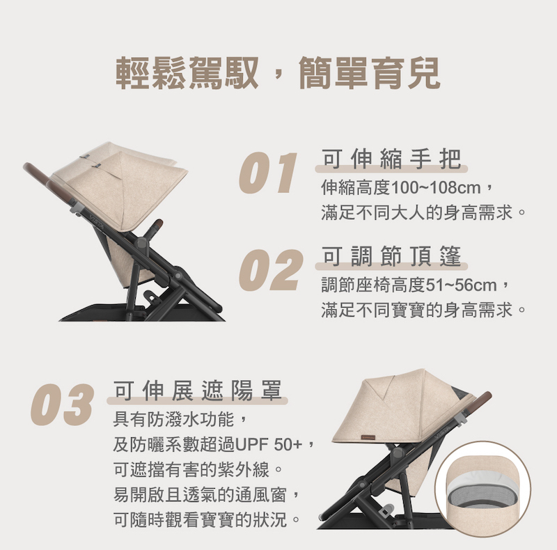 全面升級 | 全新體驗●全天候舒適座椅後背採用透氣式網布設計,同時配有可拆卸椅墊,能對應不同溫度及氣候更換。●避震強化再提升大尺寸輪胎,搭配FlexRide懸吊式避震,回彈不觸底。輕鬆乘載1-3個寶寶,面對各種地形不顛簸。並採用單腳煞車系統。●全新設計反光條車輪外框上新增反光條,讓夜晚外出更加安心安全。●五點式安全帶升級磁吸式安全扣,一鍵調節安全帶,輕鬆方便操作。●質感美學設計-鋁鎂合金材質,兼具輕量化與耐用性。手把連接處,高光設計使材質更絲滑。-手把和防撞桿以REACH認證的真皮皮革包覆。-隱藏式鉚釘設計,營造出更為精緻的美學效果。●最高規格認證GREENGUARD金牌認證,給予清新與健康的環境。●One for all 百變模式及功能-頂級車款,最多可擴充至2個座椅及一組輔助踏板。並可搭配睡箱及提籃。-座椅高度較高,出外可直接當兒童餐椅使用。兩組座椅皆可調整前後兩個方向,也能躺平至180度。-超大容量的置物空間,內容物輕鬆方便取放。-可伸展的遮陽罩,具有防潑水功能,及防曬系數超過UPF 50+,可遮擋有害的紫外線。易開啟且透氣的通風窗,可隨時觀看寶寶的狀況。