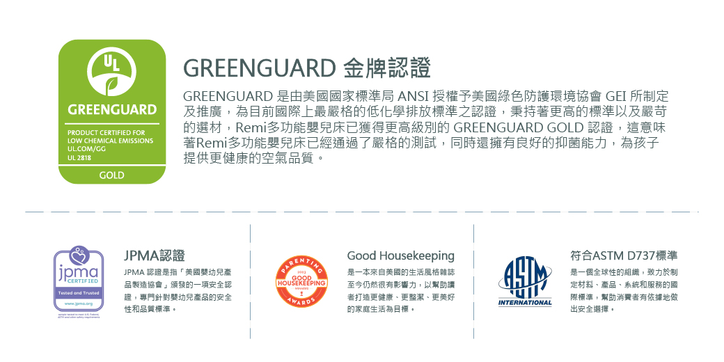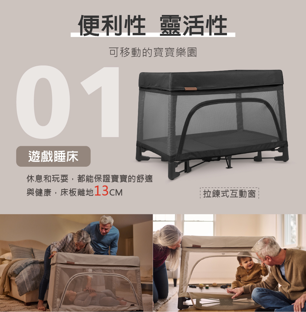 ●多功能嬰兒床,可作為睡床、遊戲床、旅行外出床●時尚簡約外觀可完美融入任何室內空間,不顯突兀●附贈旅行袋,輕便攜帶不占空間。免安裝,單手就能快速開合,方便移動到各種位置●可額外加裝Remi尿布台。不使用時,無須拆卸,旋轉折疊即可收納●下層底部七個支撐點分散受力,提升床的穩定性並更加牢固●上層為可拆卸拉鍊式設計睡床,適合新生兒使用,也可以當床邊床。提供四重安全防護,使用上更加安心●四面網布設計,能隨時掌握寶寶狀況。其一面為拉鍊式互動窗,方便爬行或走路的寶寶進出,父母更輕鬆●三層網狀床墊,不悶熱透氣性佳。床罩可拆下機洗。附贈有機棉製的床包。皆通過ASTM D737測試,安全又安心●有機棉床墊3.8cm厚度,給新生兒寶貝脊椎舒適且高支撐力的保護。不需要額外使用床墊及床罩●通過GREENGUARD綠色環保金牌、JPMA、Good Housekeeping三重認證。給予寶寶健康的空氣品質
