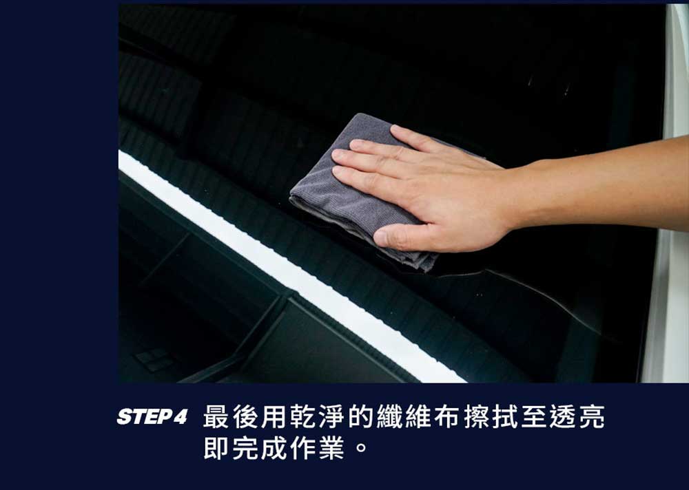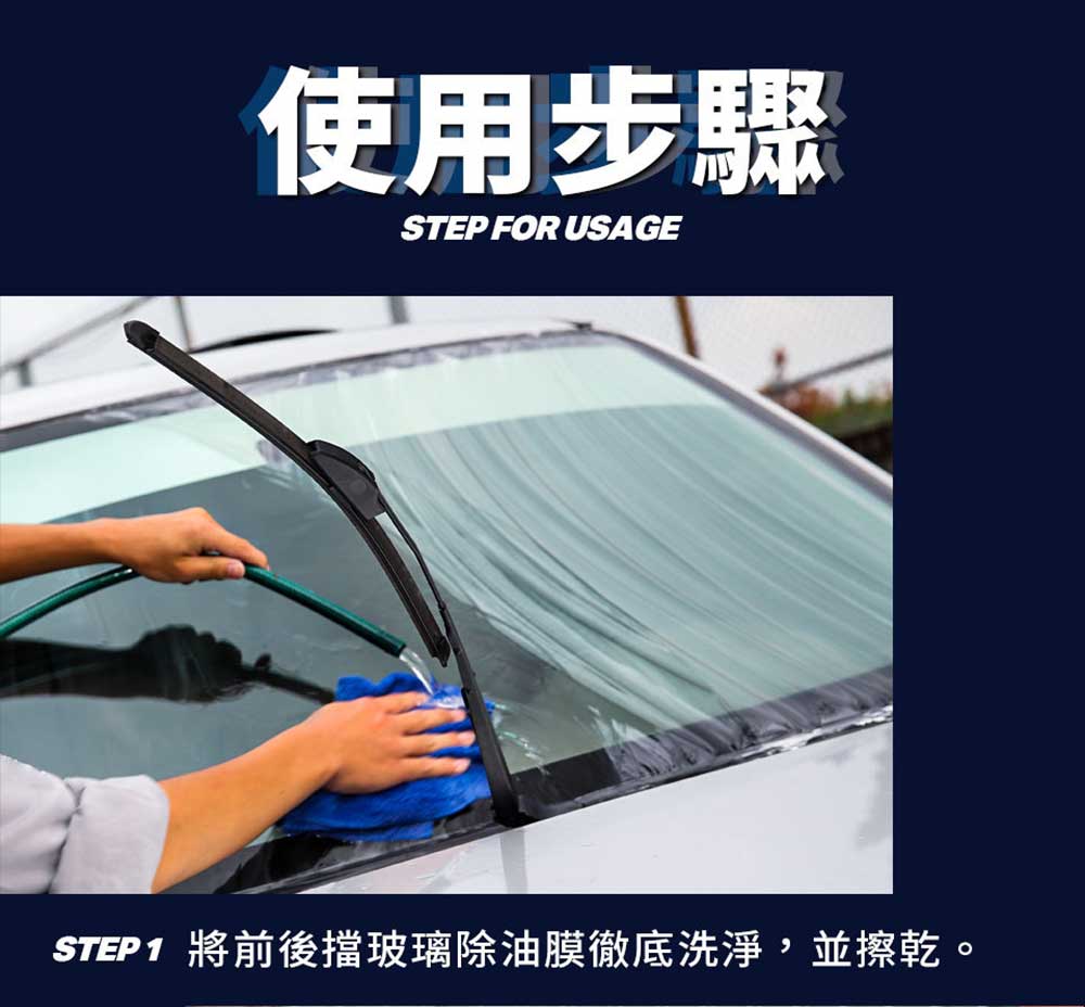 1.徹底清除擋風玻璃的油膜,並完全擦乾。2.首選使用【VANGUARD 油膜去除劑玻璃重垢歸零膏】。3.正確去除玻璃上油膜後,將單入玻璃鍍膜巾撕開。4.立即將超級氟素玻璃鍍膜巾均勻塗佈在玻璃上。5.以直線雙向均勻塗抹在擋風玻璃上。6,約五分鐘,讓超級氟素潑水劑乾燥,即可完成潑水鍍膜分子鍵結結構。7.最後使用擰乾後的超細纖維布擦拭,使擋風玻璃透亮即完成。