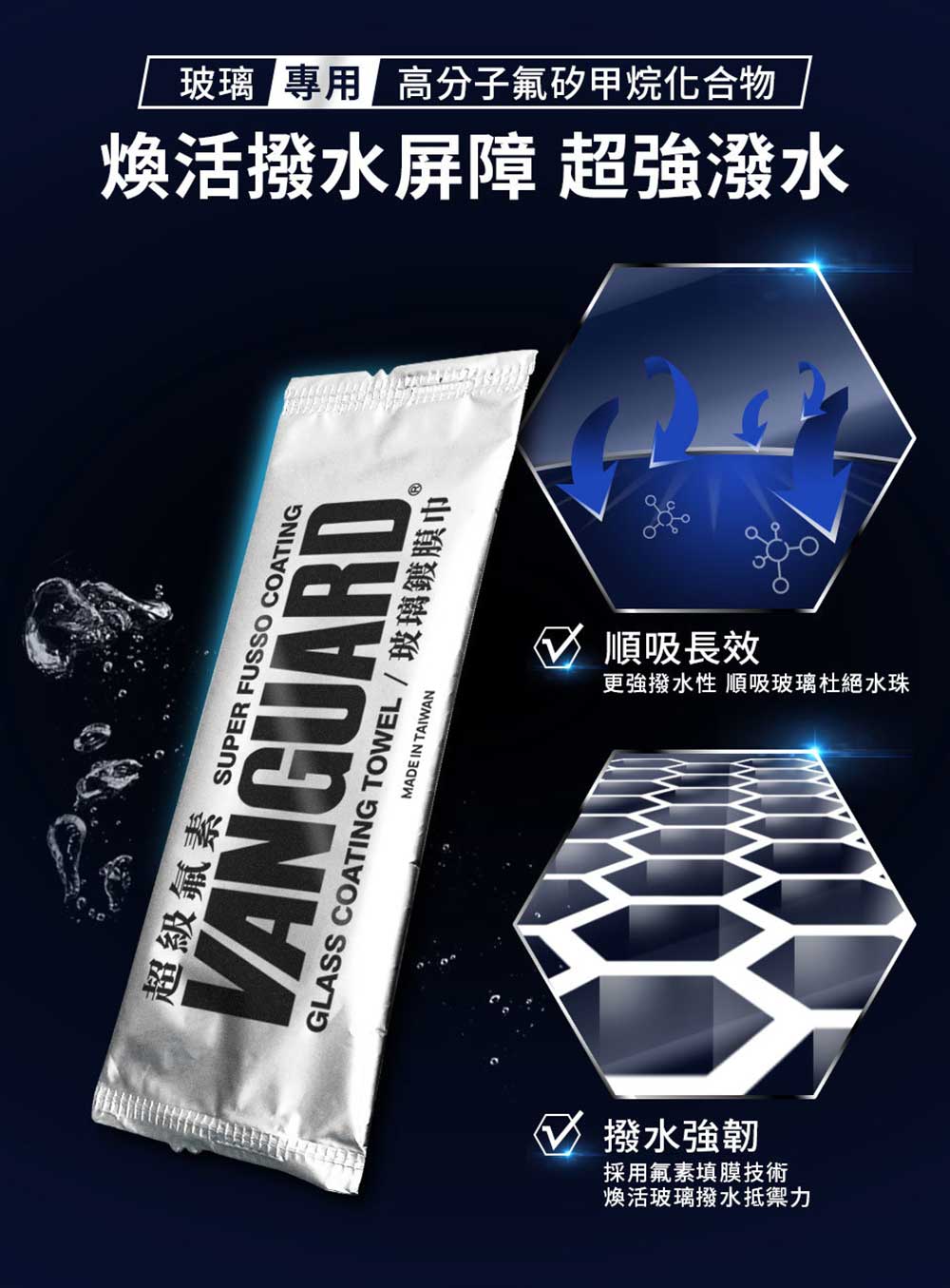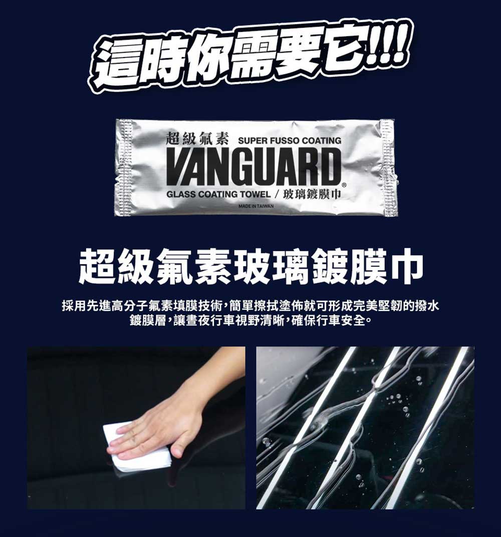 . 品名:VANGUARD超級氟素玻璃鍍膜巾. 成分:IPA醇類、特殊氟素、高分子氟矽烷化合物. 尺寸:200x230mm. 包裝:1條/包. 保存期限:6年. 產地:台灣-KYOEI化學實驗室