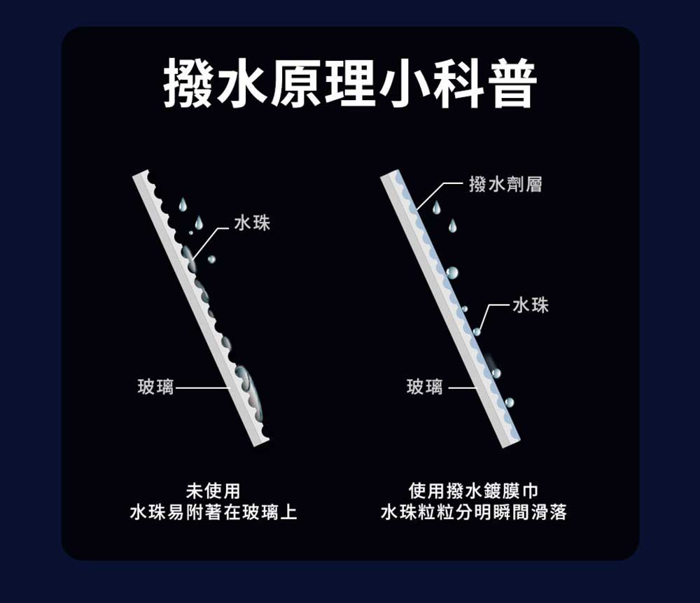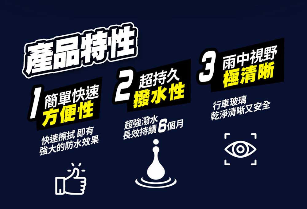 . 先進超級氟素填膜技術。. 讓前擋玻璃充滿透明撥水塗層。. 兩倍的高分子氟素配方。. 雨滴立刻被彈飛。. 單入鍍膜巾,攜帶好方便。. 濕紙巾款式,操作玻璃無死角。. 單獨包裝使用時不怕交叉汙染。. 不用10分鐘即可完成操作。