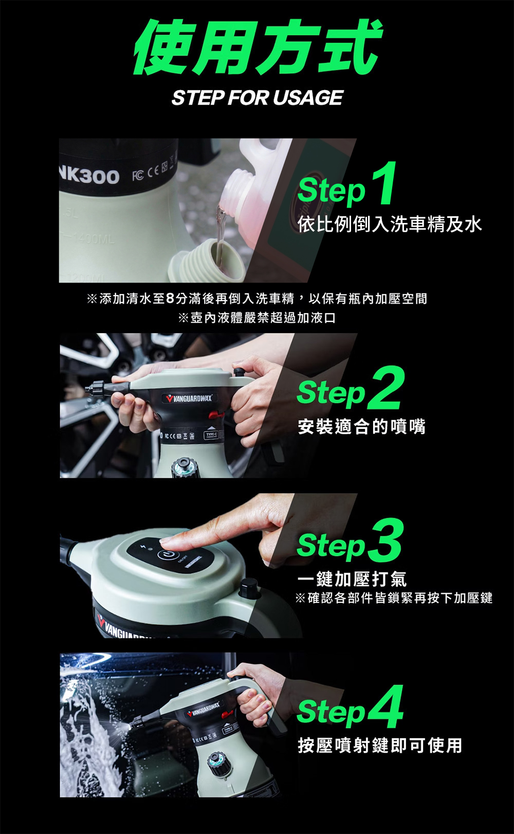 扇形大範圍細緻綿密泡沫,僅需按壓打氣鈕,待氣壓充足後,輕壓噴灑泡沫開關,自動噴射濃密泡沫,愛車清潔零死角。