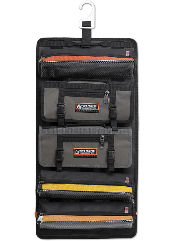 3 個可拆卸的多色半透明大容量拉鍊工具捲袋 (RP-LC),即使工具卷懸掛起來也能安全取用袋內物品。