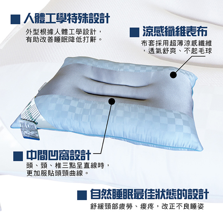 ★特色: .人體工學特殊凹槽設計,仰睡時可主動貼合頸部空隙,讓人輕鬆入眠.舒緩頸部疲勞感、痠疼;改正不良睡姿,降低打鼾。.左右移動會有輕微限制幫助您處於中心位置。.布套採用超薄涼感纖維表布,透氣舒爽、不起毛球