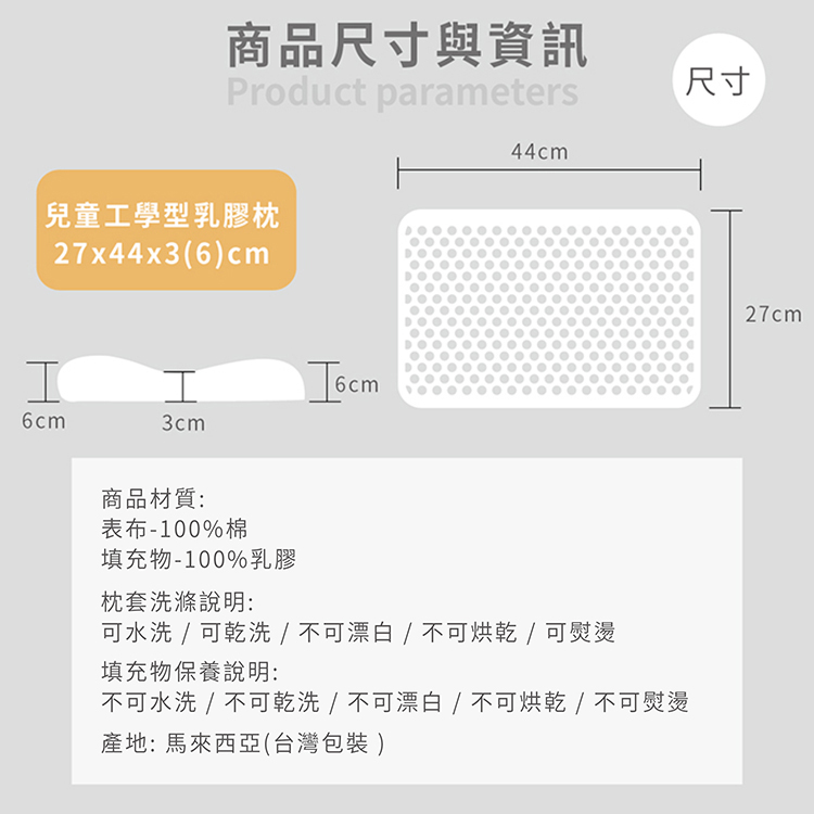 ★材質:天然乳膠 表布-100%棉 填充物:100%乳膠★特色: 符合嬰兒頭型的設計,給您的寶貝最舒適的角度一覺到天明。 具有抗微生物與抗過敏特性,符合人體舉動的設計,以獲得最好的支撐。這給予活力的枕頭能幫助您夜晚酣睡至天明 ★內容件數:乳膠枕*1 ★產地:馬來西亞 (台灣包裝)★尺寸:27*44*6cm ★網頁圖片因拍攝關係,與實品略有差異,實際顏色以出貨為主 ★產品圖僅供參考,實際內容以上述內容件數為主。 ★表布洗滌方式:可水洗╱不可乾洗╱不可漂白╱不可烘乾╱可熨燙★填充物保養方式:不可水洗╱不可乾洗╱不可漂白╱不可烘乾╱不可熨燙