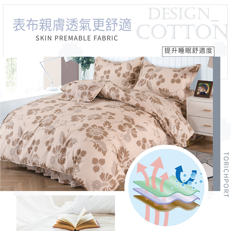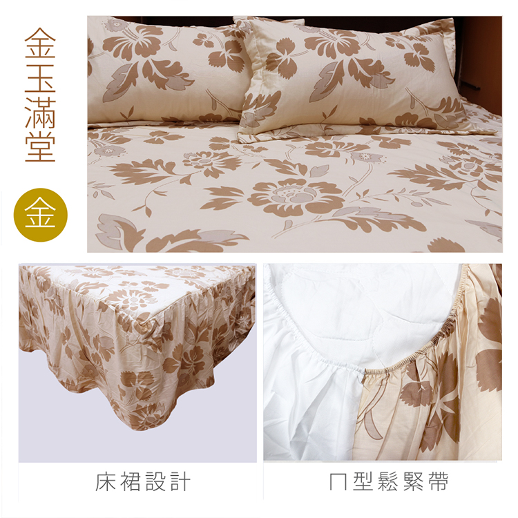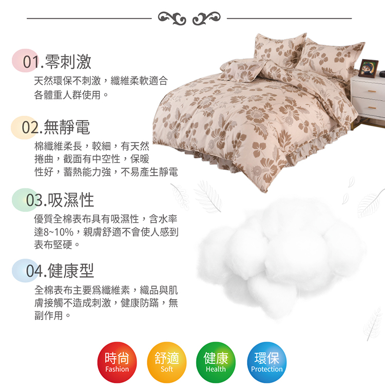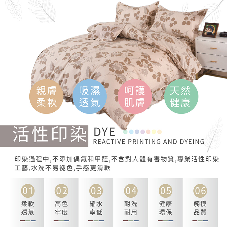 【內容件數與尺寸】床罩x1件-6x6.2尺(180x186cm) 兩用被套x1件-6x7(180x210cm)鋪棉枕套x2件-45x74cm靠墊x1件-30x40cm