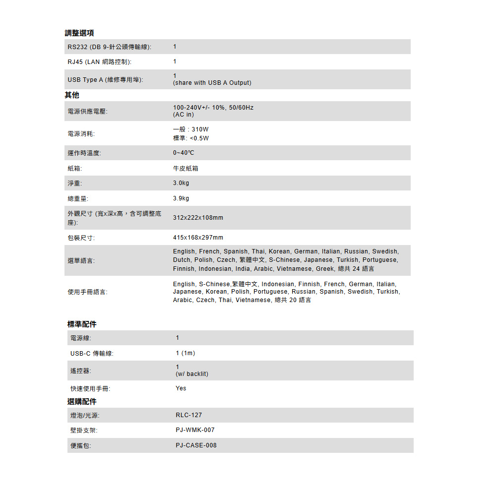 -外觀尺寸 (寬x深x高,含可調整底座): 312x222x108mm
