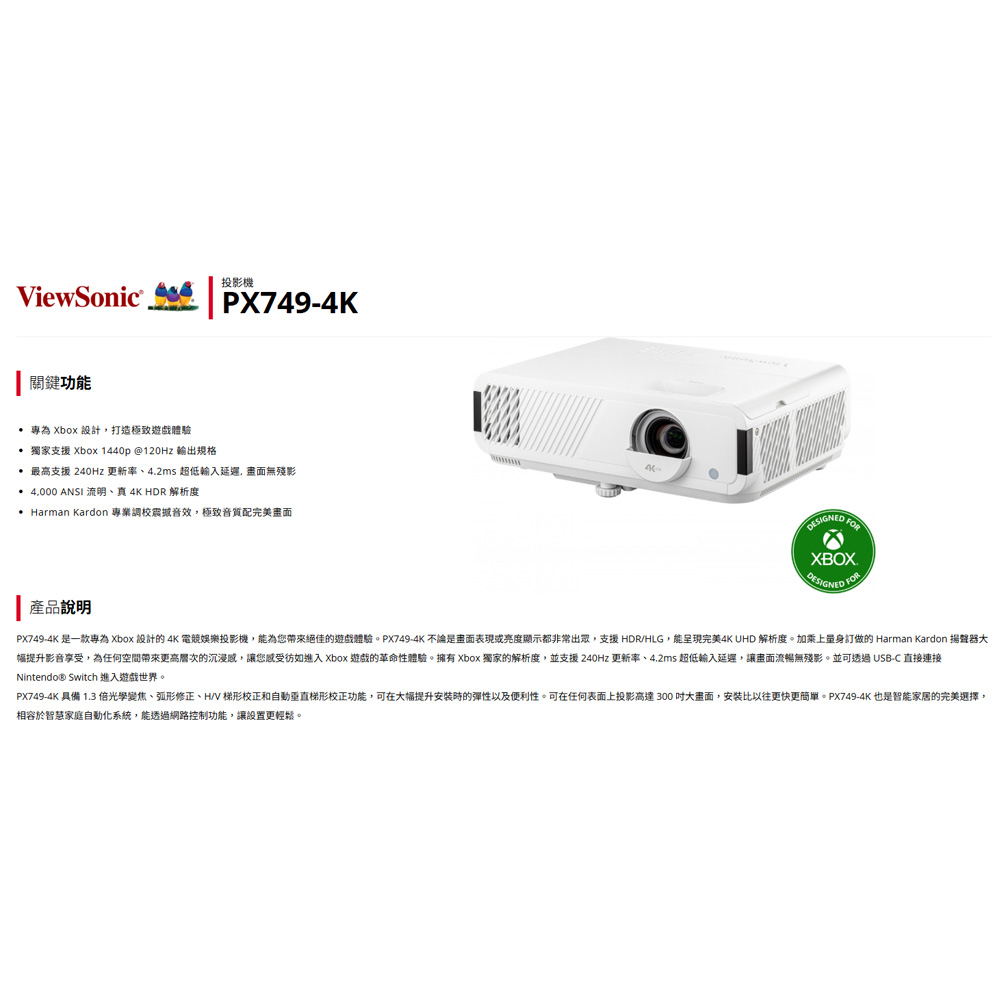 昌運監視器 ViewSonic PX749-4K 專為 XBOX 設計電玩娛樂超低延遲 4,000 ANSI流明投影機