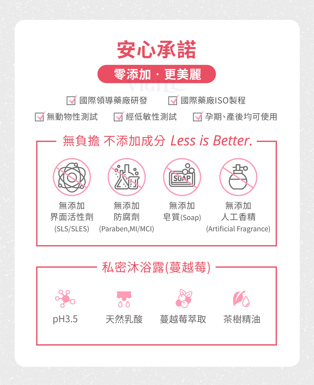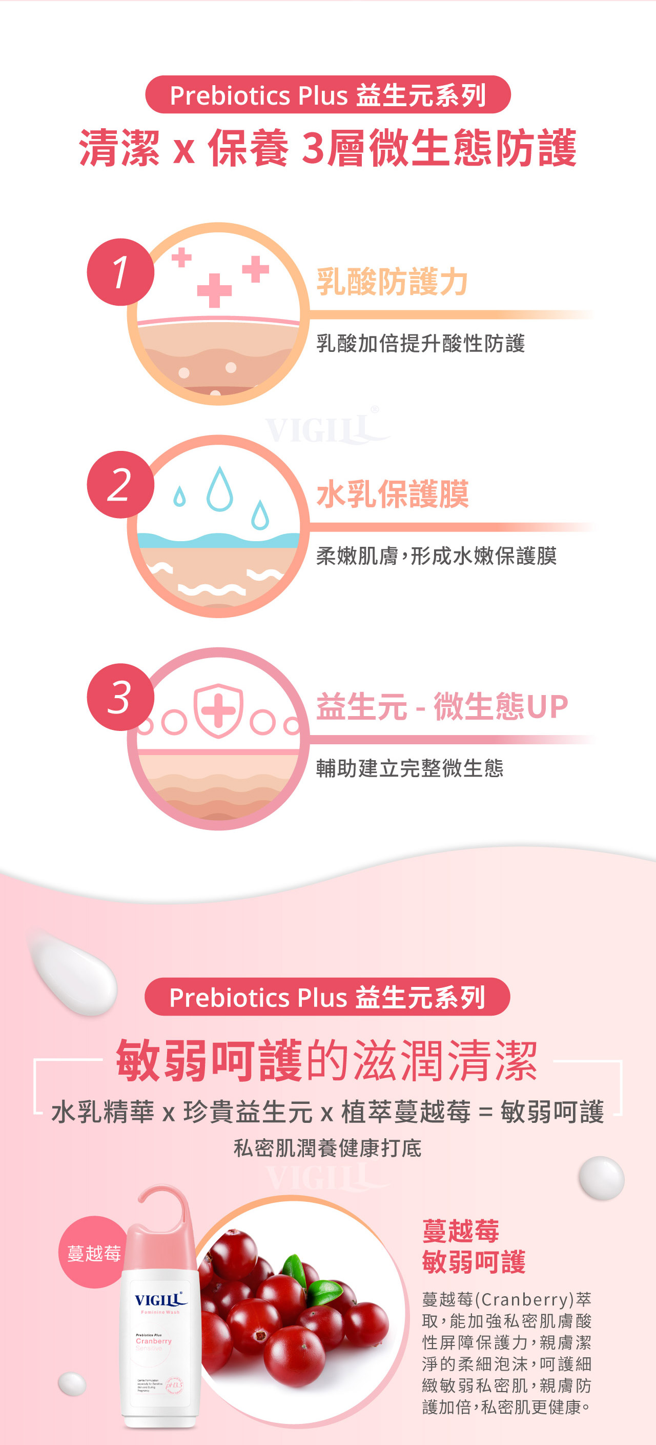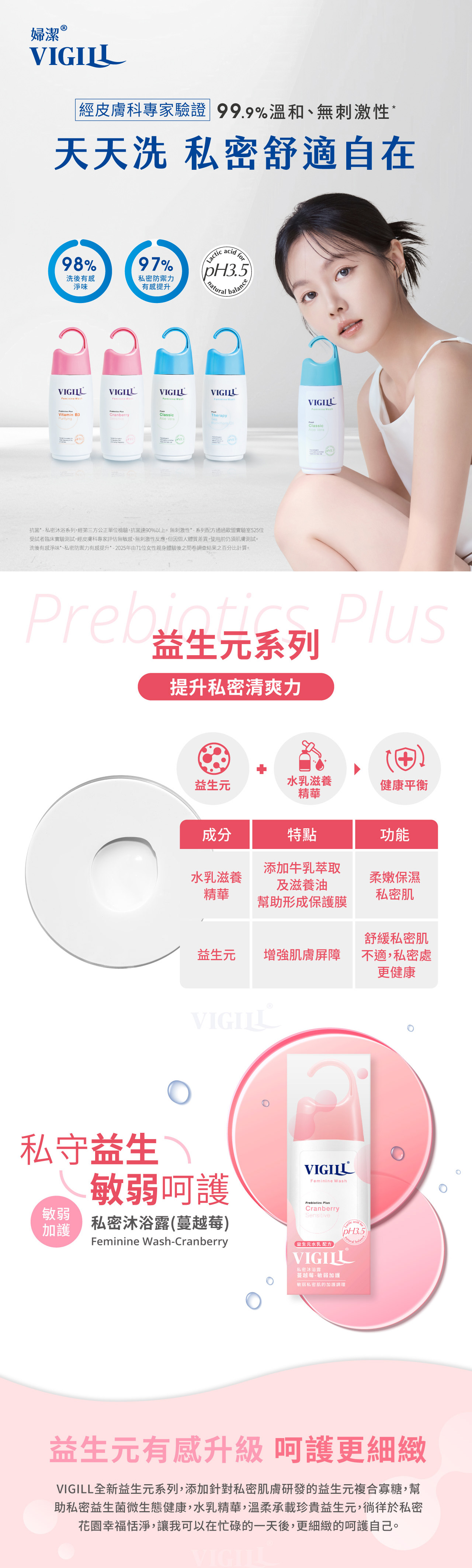 pH3.5私密酸- 天然乳酸精準調理私密細緻肌膚酸鹼平衡,維持酸性環境。益生元Plus-添加針對私密肌膚研發的益生元複合寡糖,幫助私密益生菌微生態健康。水乳滋養精華- 水乳精華含滋養油、牛奶萃取Lactose及游離脂肪酸,賦予私密肌柔軟滋潤的保護膜。蔓越莓- 含多種營養素,加強私密肌膚酸性屏障保護力,私密更健康。