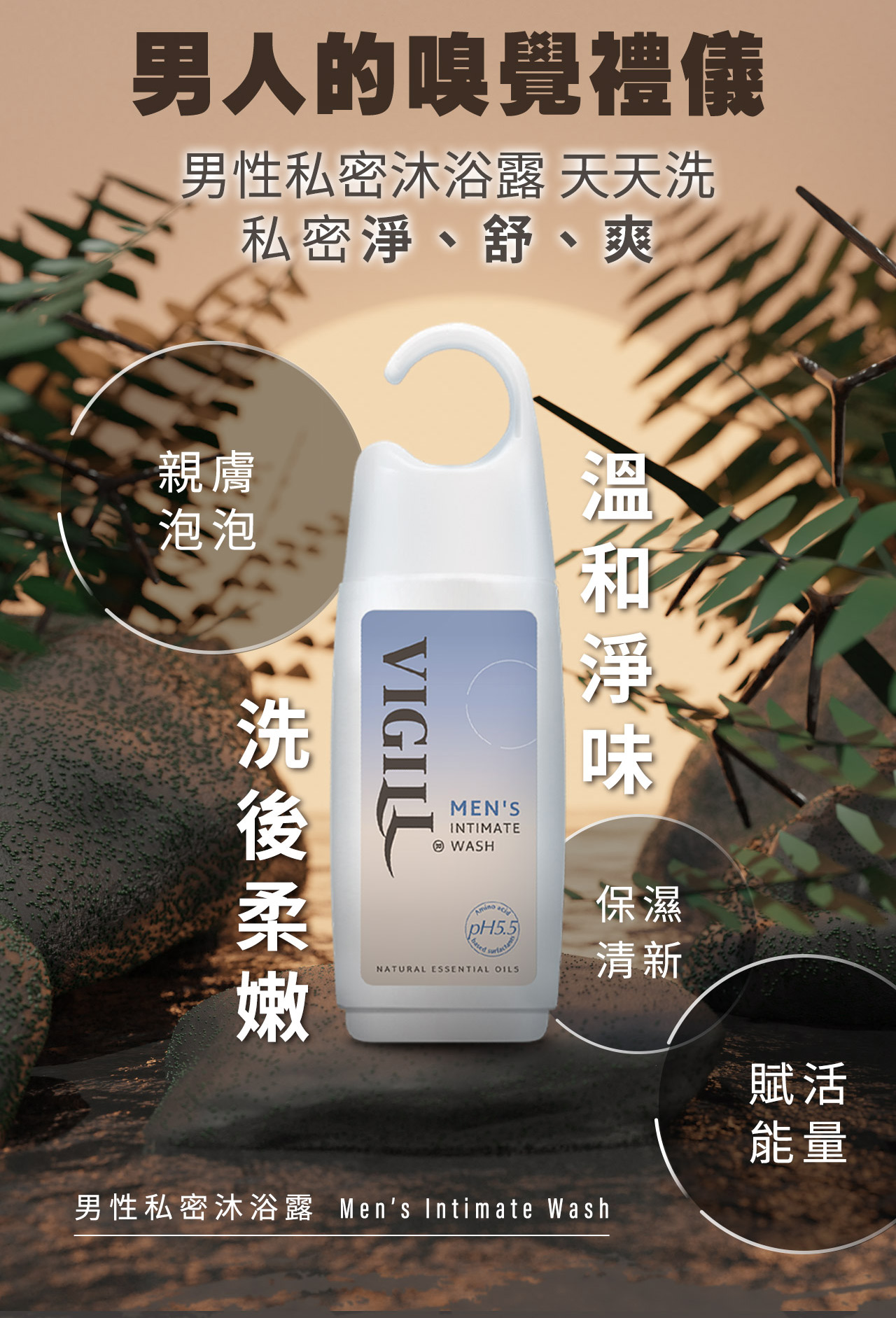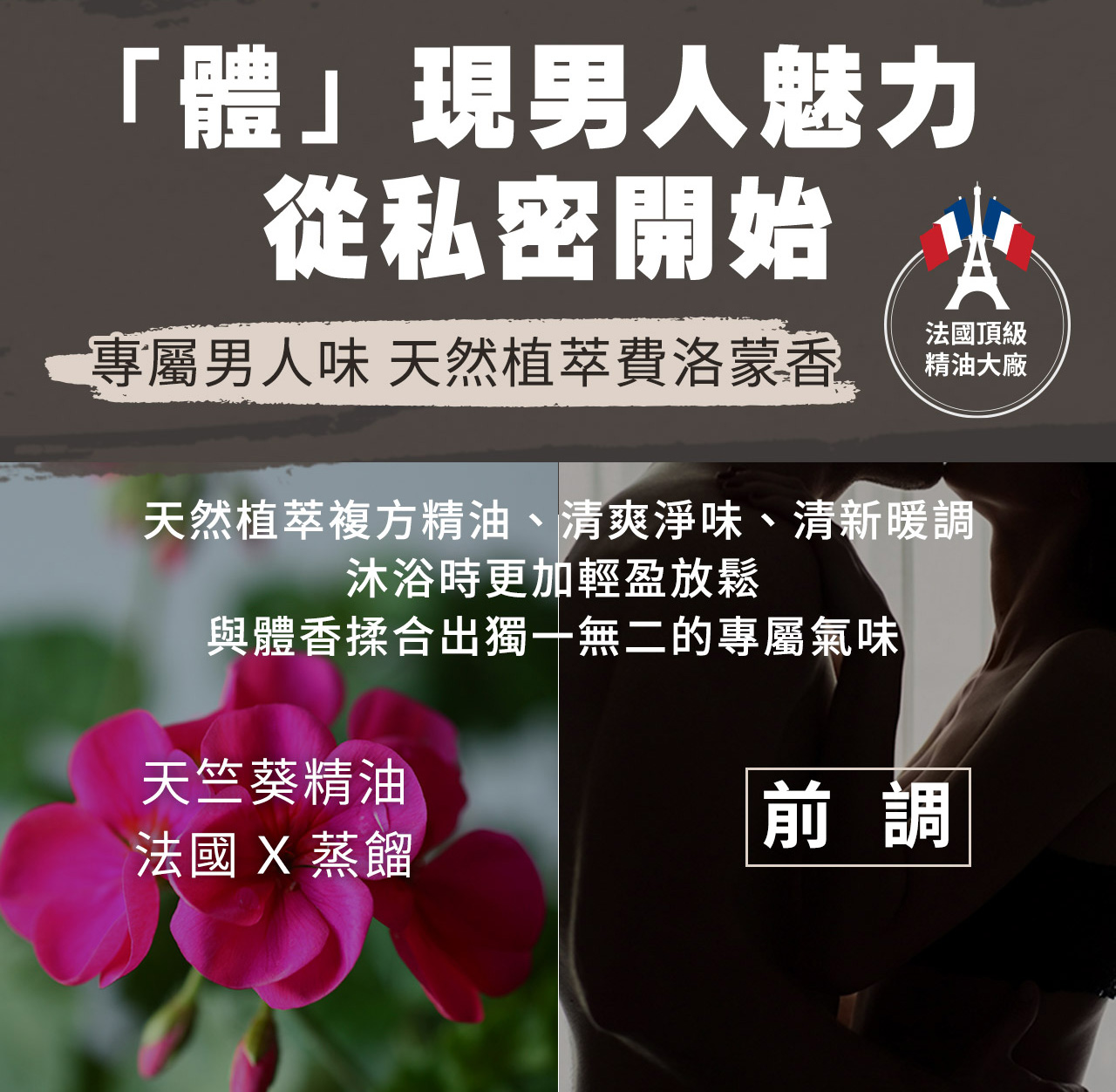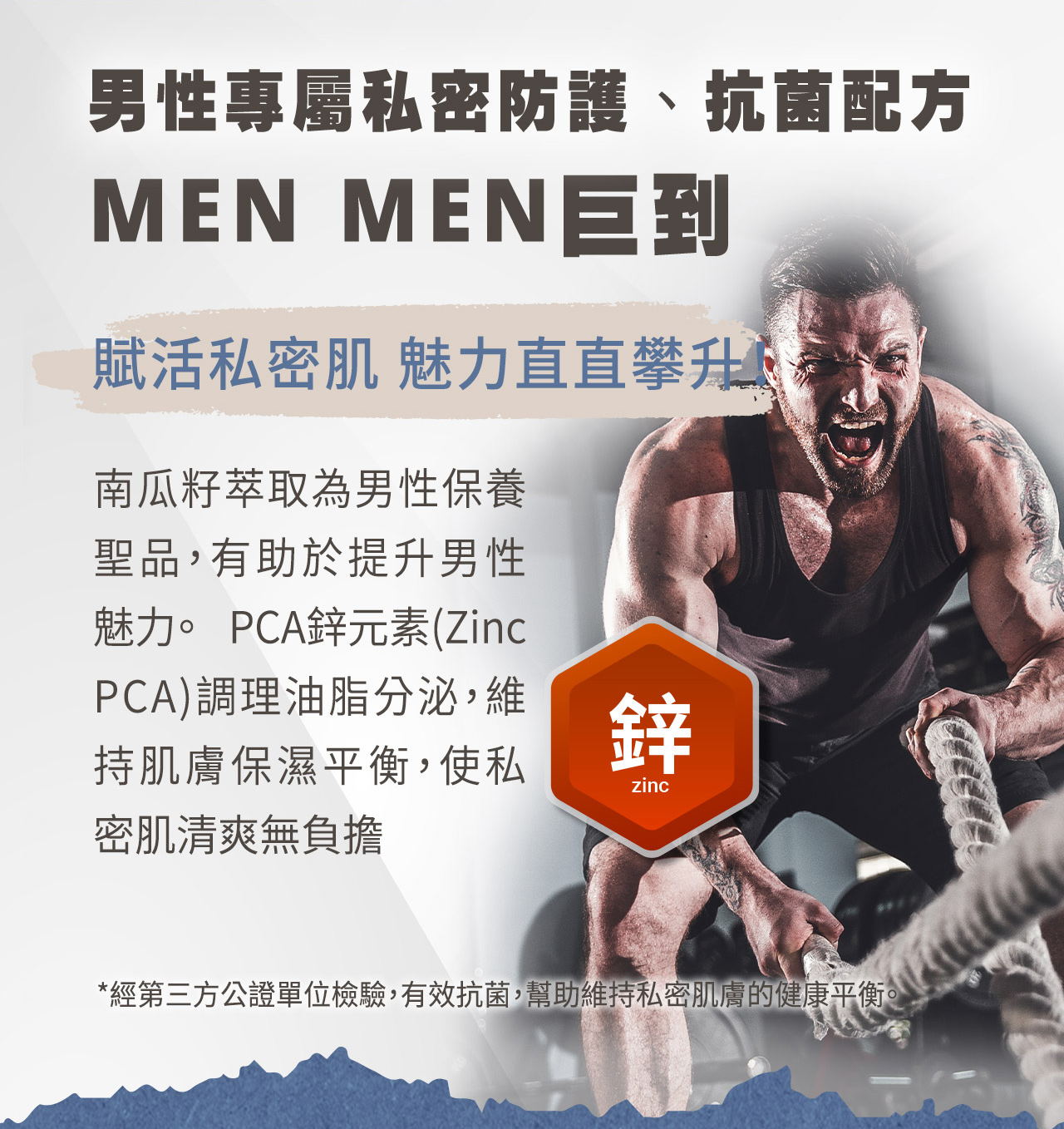 清新淨味-複方天然系男人味精油,佛手柑、薰衣草、天竺葵精油,洗淨汗水、尿液、異味。舒適親膚- pH5.5平衡親膚配方,搭配胺基酸系潔淨成分的細緻泡沫,清爽親膚。賦活私密肌-南瓜籽萃取與PCA鋅元素,賦活男性私密肌,增添魅力。修護肌膚-添加神經醯胺及海洋深層水微量元素。