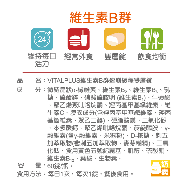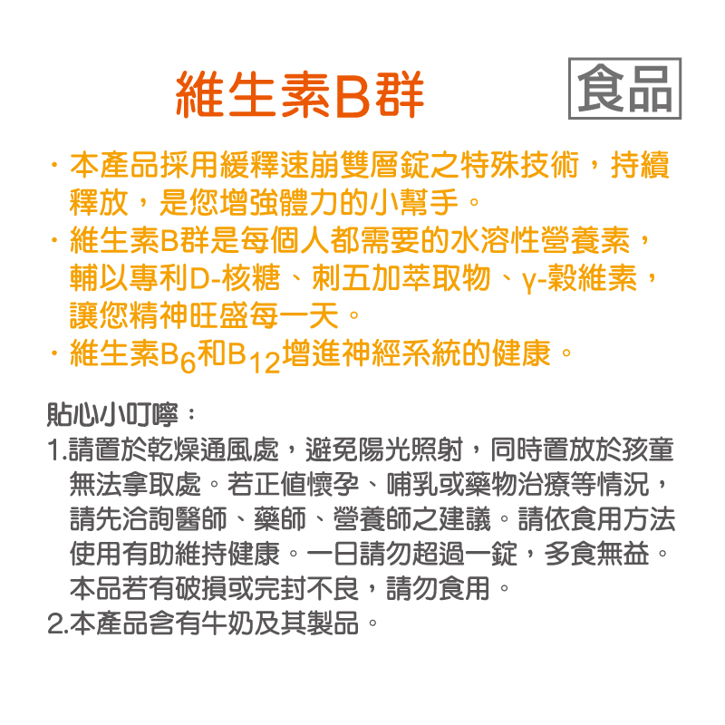 ✔本產品採用緩釋速崩雙層錠之特殊技術 ✔持續釋放,是您增強體力的小幫手 ✔維生素B群是每個人都需要的水溶性營養素 ✔輔以專利D-核糖、刺五加萃取物、γ-穀維素,讓您精神旺盛每一天 ✔維生素B6和B12增進神經系統的健康 ✔本品若有破損或完封不良,請勿食用。