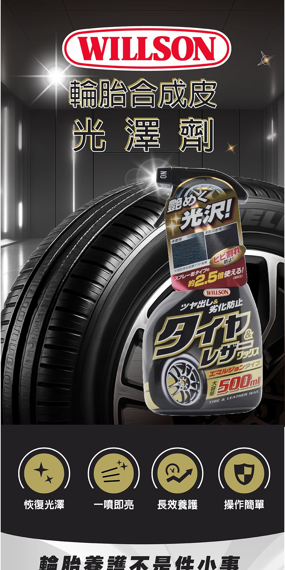 不只適用於輪胎,更能全面應用於車內合成皮革、儀表板、車門飾板、塑膠件與橡膠條,一次搞定車內外亮澤保養!