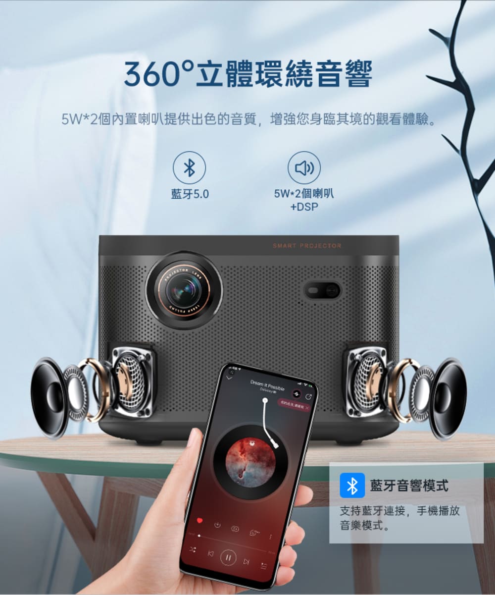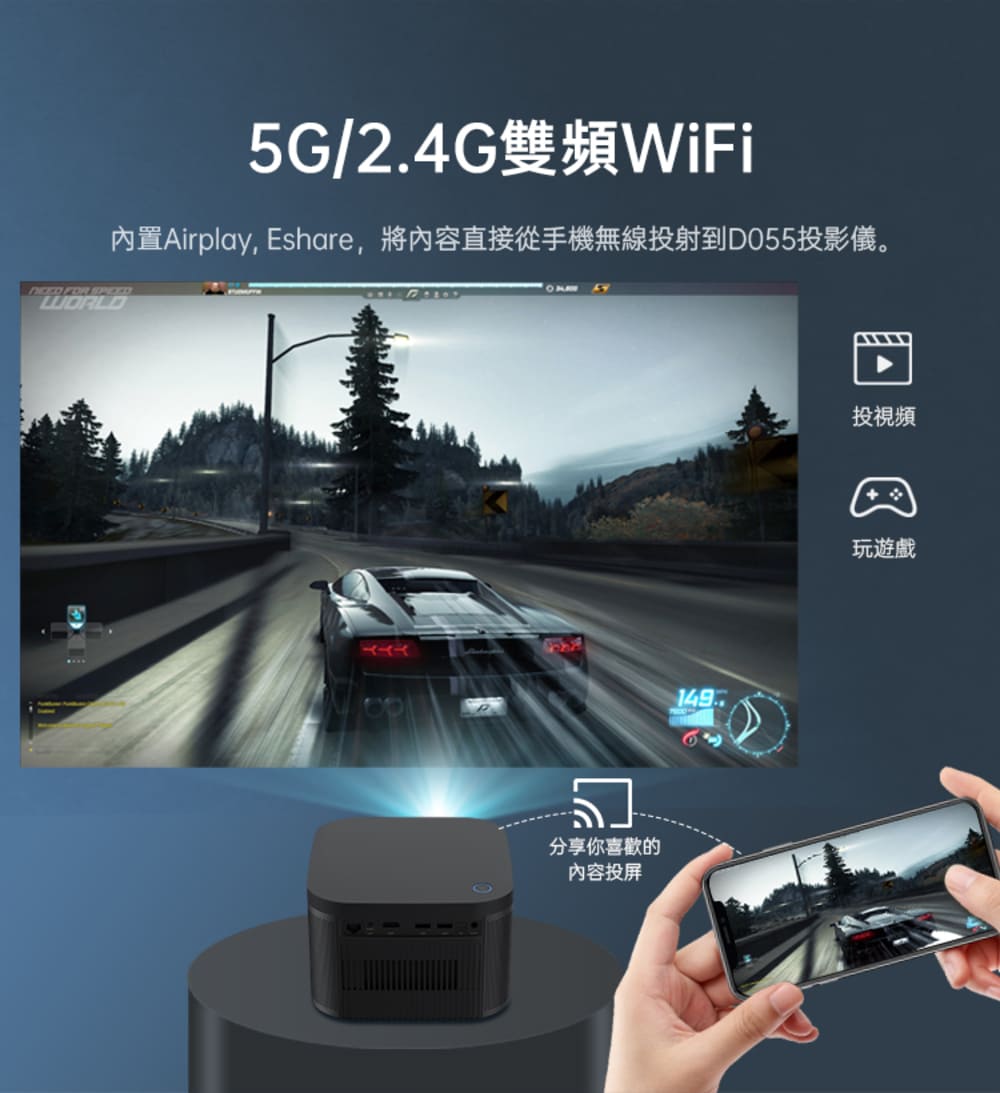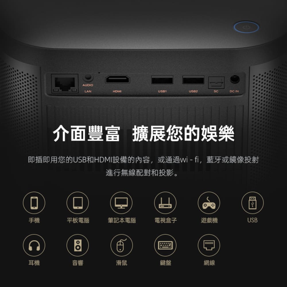 DLP LED 光機750 ANSI (3000市場流明)1920 x 1080 FHD解析度支援4K影片播放支援各大影音串流平台自動對焦、四角校正支援Miracast/Airplay/Eshare高音效10W喇叭飛鼠遙控器內建WIFI,BT藍牙安卓11.0系統包容性強190 x 190 x 130 MM重量:2.05 kgs