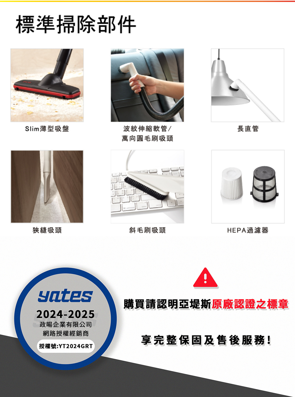 產品名稱:Yates MD-880ST產品電壓:16.8.V電池容量:4000mAh充電時間:約2.5小時吸力:9kpa-13kpa重量:1.12kg(主機重量)功率:200W產地:台灣BSMI認證:R3F474【商品內容物清單】1.主機2.長直管3.伸縮管4.Slim薄型多功能吸盤5.隙縫吸頭6.斜毛刷吸頭7.360度萬向刷吸頭8.充電器9.操作手冊-----原廠獨家贈送-----Hepa濾心x1【五項產品保障,優質售後,絕對是品質保證】品牌在台已深耕8年,熱銷破萬台產品為二年保固,電池一年保固,由Yates亞堤斯原廠-政暘企業負責售後客服產品零件皆在台灣,售後維修快速【保固注意】※本產品切勿吸水、潮濕物品,會造成機內電路損壞,未安裝過濾棉就使用以致馬達毀損等人為疏失,不予保固,請注意!!※請勿自行拆解以免造成危險,自行拆解即喪失您的保固權益,請留意
