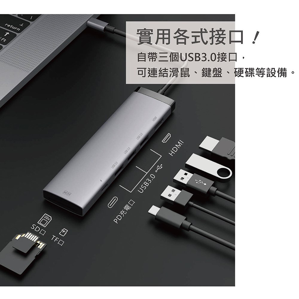 高清4K體驗,連接精彩生活實用各式接口,可連結滑鼠、鍵盤、硬碟等設備支援TF&SD,且可同時使用功能強大,滿足絕大多數需求產品尺寸:約139*36*11.8mm / 產品淨重:50g主要材質:ABS+鋁合金金屬+PC輸入端:USB-C公 / USB規格:3.0輸出端:HDMI母、SD卡座、TF卡座、USB3.0母、USB-C母支援系統:Mac OS、Windows、Linux以上規格依原廠提供資料為準,實際以出貨商品為準。📌因超商體積限制,超商取貨僅能寄送一個,超過一個請選擇宅配或是分開下單唷!(!!選擇超商請勿再下單其他商品!!若無法超商寄件會另外通知!!)
