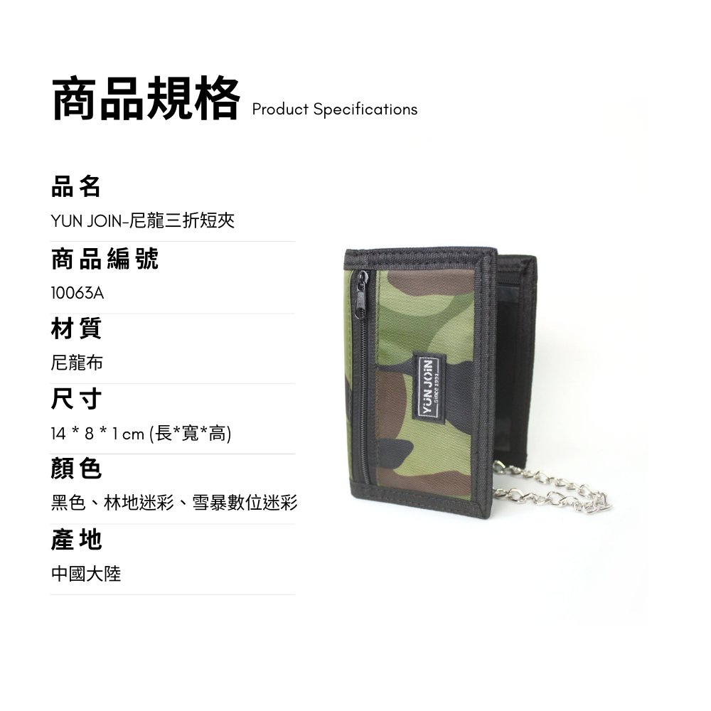 【產品介紹】YUN JOIN 迷彩三摺短夾活潑帥氣的設計適合學生年輕族群使用材質:尼龍布結構:三折式短夾顏色:林地迷彩、雪暴數位迷彩、黑色(迷彩布為隨機裁切,所以每個商品紋路皆不同,是獨一無二的)#YUNJOIN #短夾 #皮夾 #男性 #中性 #布料 #聖誕節禮物 #尼龍 #潮流 #輕巧 #迷彩 #禮物