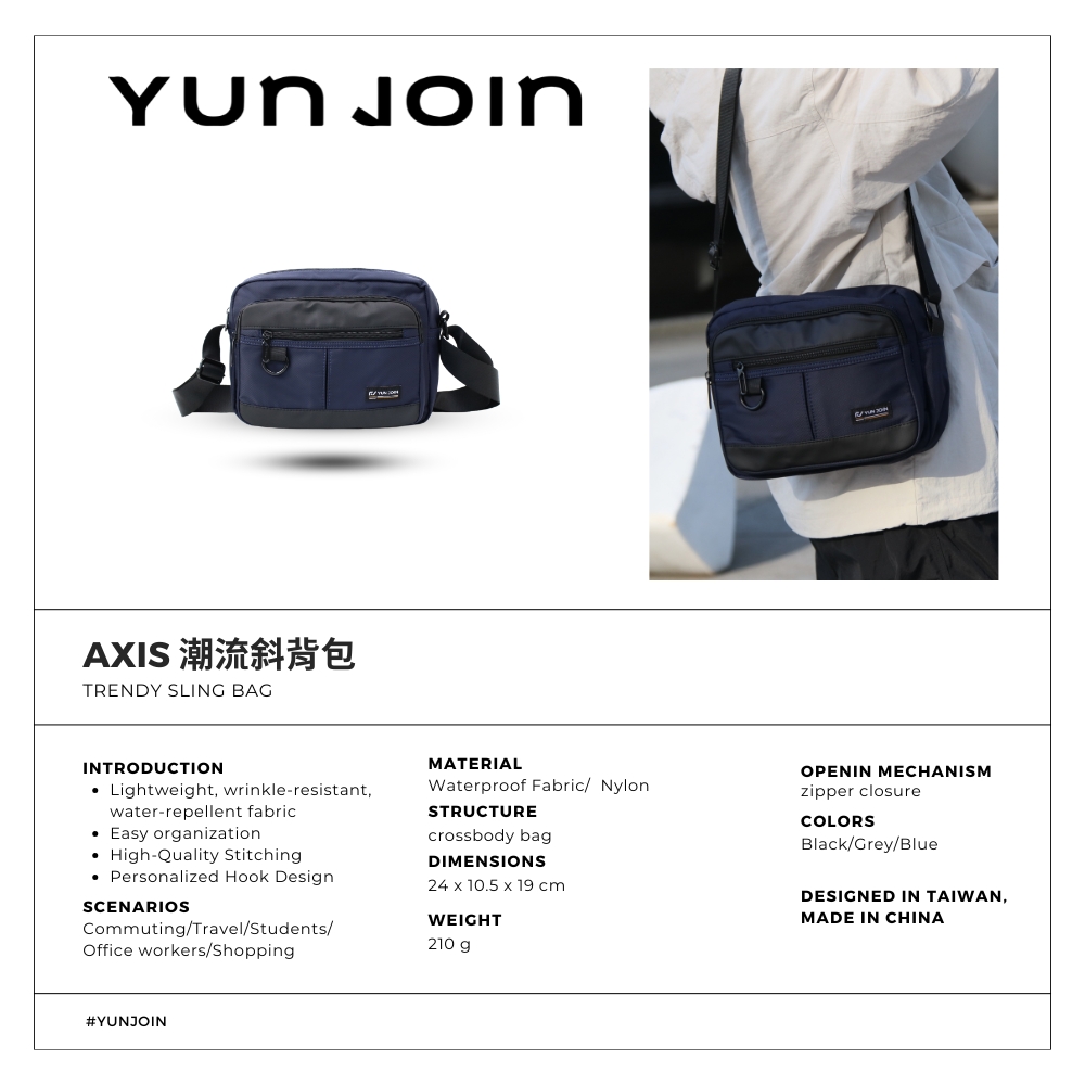 感謝各位蒞臨 YUNJOIN本賣場公司現貨供應且隨訂單由蝦皮代開立電子發票合法登記營業之店家,安全品質有保障~2025 年版本LOGO 皆更換成新款樣式~"AXIS"指「軸」、「中心」或「核心」象徵穩定性、結構與連結的平衡點,展現低調與潮流的完美融合。以 "輕量格子布" 與 "防水材質" 打造,兼具實用性與時尚感,輕便隨行。設有 5 個收納空間,輕鬆整理隨身物品,是通勤與休閒穿搭的理想選擇【產品介紹】●YUNJOIN潮流斜背包總共 5 個收納空間外部 - 主包體分兩層收納,前後各有一個拉鍊袋。前方外側另有一個收納空間。內部 - 後側為拉鍊收納袋。方便實用、素面質感,休閒上班都合適。●材質:尼龍布●結構:側肩包●尺寸:24 * 10.5 * 19 cm (長*寬*高)●顏色:黑色、藍色、灰色 (顏色可能會因攝影或螢幕有些微差異)●重量:210 g#隨身袋 #方便 #實用 #尼龍 #潮流 #肩背包 #斜背包 #斜肩包 #側背包 #公事包 #輕量 #收納 #porter #防潑水──────────────────────────────────────────────────────────────────── 【客服】線上快速諮詢有問題歡迎詢問,專人在線為您服務。若有任何問題或是收到商品時發現異常,可拍照片傳至聊聊客服人員上班時間會馬上為您處理。服務時間:週一至週五09:00~18:00