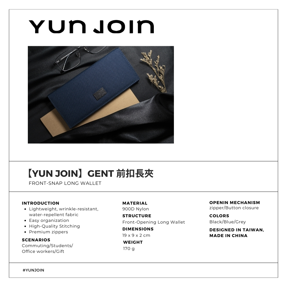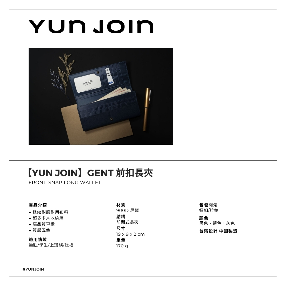 感謝各位蒞臨 YUJI本商店絕對 100% 公司現貨供應且商品一律附上發票合法登記營業之店家,安全品質有保障。【產品介紹】前扣對折式長夾簡約的設計適合都會上班族、學生使用內部分上下兩側,各有6個卡位。可收納很多卡片。大鈔夾層上下各二,下層除了卡位夾層外還有拉鍊零錢收納夾層、暗袋非常適合收納發票收據等雜物。【產品規格】材質:900D 尼龍布尺寸:19 * 9 * 2 cm重量:170 g結構:對折式長夾顏色:黑色、藍色、灰色#YUNJOIN #長夾 #皮夾 #錢包 #皮夾#日系 #素面 #典雅 #耐看 #耐用 #紳士#防潑水─────────────────────────────────────────────────────────────【客服】線上快速諮詢有問題歡迎詢問,專人在線為您服務。若有任何問題或是收到商品時發現異常,可拍照片傳至聊聊客服人員上班時間會馬上為您處理。服務時間:週一至週五09:00~18:00