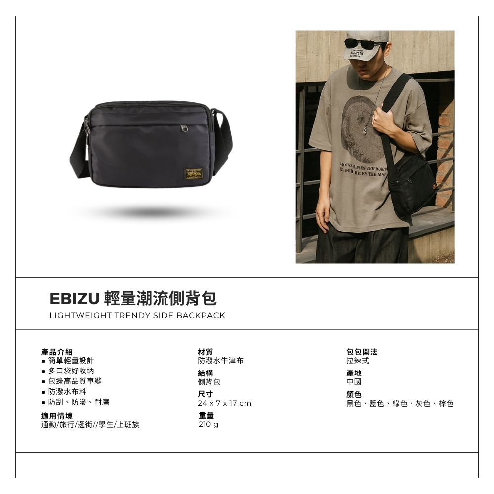 【產品介紹】●材質:潑水牛津布●結構:側肩包●尺寸:24 * 17 * 7 cm (長*寬*高)●顏色:黑色、藍色、灰色、軍綠 、卡其 (顏色可能會因攝影或螢幕有些微差異)●重量:210 g