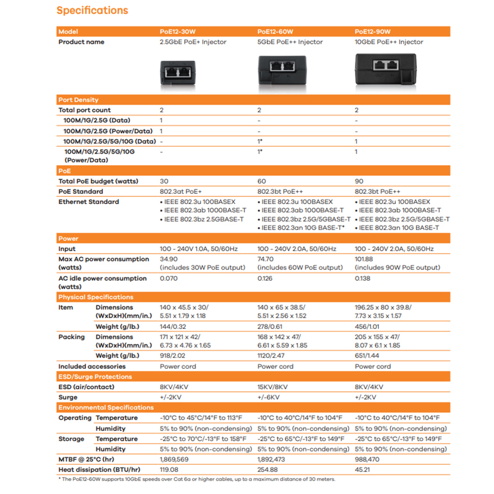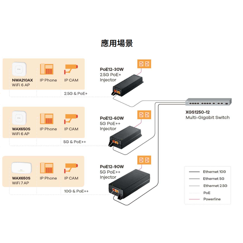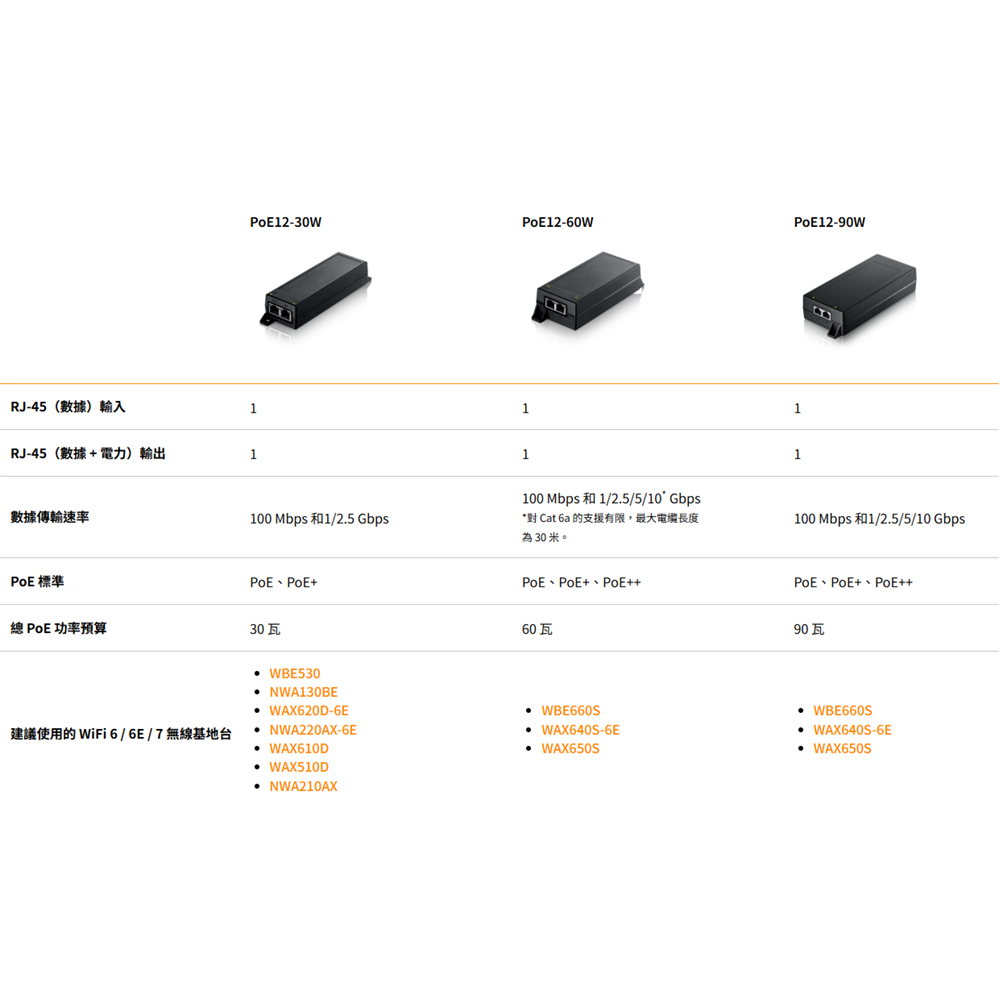 Zyxel 乙太網路電源供應連接器滿足用戶對高速網路設備連接需求的增長,例如 WiFi 7 和 WiFi 6 無線基地台、監控 PTZ 攝影機以及先進的 POS。PoE12-30W支援高達 2.5Gbps 的網路速度,而 PoE12-60W 和 PoE12-90W 則支援高達 10Gbps 的網路速度。(對 Cat 6a 的支援有限,最大電纜長度為 30 米。)