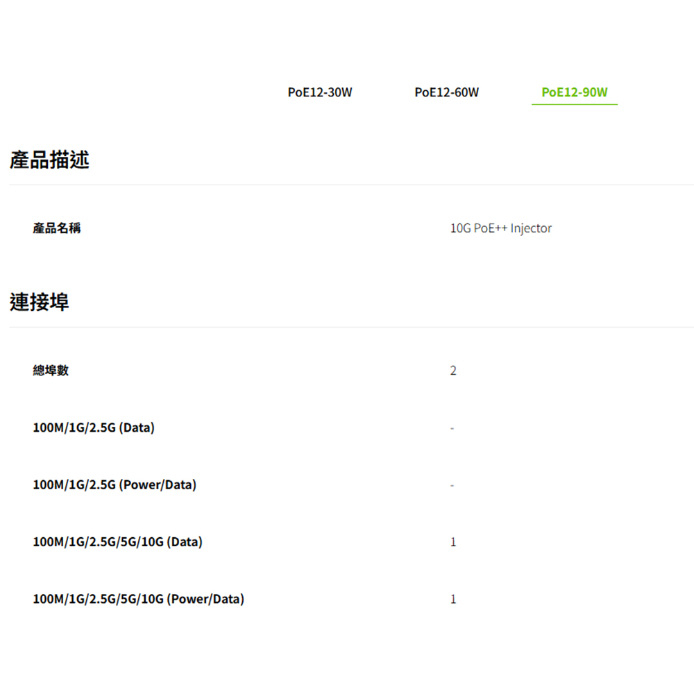 PoE12-30W 符合 IEEE 802.3at PoE+ 標準,而 PoE12-60W 和 PoE12-90W 則符合 IEEE 802.3bt PoE++ 標準,分別提供最高 30W、60W 和 90W 的 PoE 電力。這些產品確保與其他標準兼容的 PoE 設備的互操作性和兼容性。