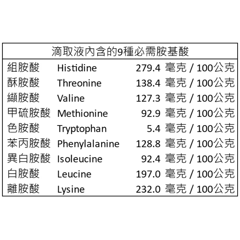 營養標示 每一份量 50毫升 本包裝含 12份 每份 每100毫升 熱量 15.8大卡 31.6大卡 蛋白質 4.0公克 7.9公克 脂肪 0公克 0公克 飽和脂肪 0公克 0公克 反式脂肪 0公克 0公克 碳水化合物 0公克 0公克 糖 0公克 0公克 鈉 48.3毫克 96.5毫克 滴取液內含的9種必須胺基酸 1.組胺酸 Histidine 279.4毫克 / 100公克 2.酥胺酸 Threonine 138.4毫克 / 100公克 3.纈胺酸 Valine 127.3毫克 / 100公克 4.甲硫胺酸 Methionine 92.9 毫克 / 100公克 5.色胺酸 Tryptophan 5.4 毫克 / 100公克 6.笨丙胺酸 Phenylalanine 128.8毫克 / 100公克 7.異白胺酸 Isoleucine 92.4 毫克 / 100公克 8.白胺酸 Leucine 197.0毫克 / 100公克 9.離胺酸 Lysine 232.0毫克 / 100公克