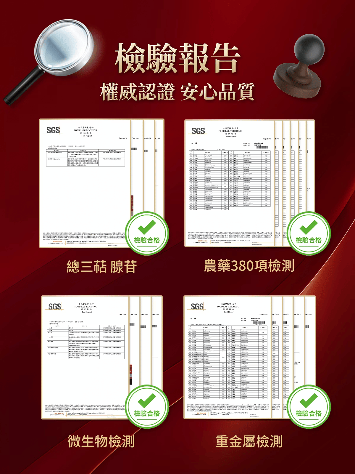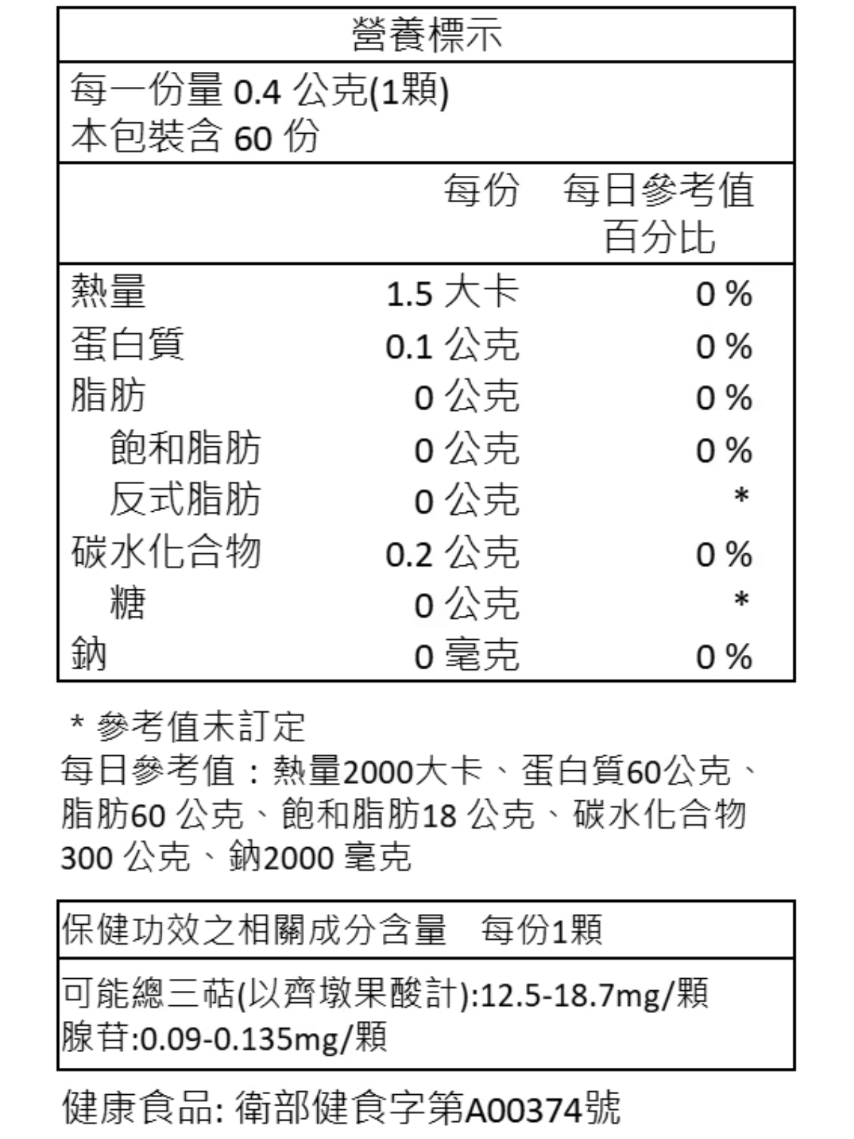 營養標示 每一份量 0.4公克(1顆) 本包裝含 60份 每份 每日參考值百分比 熱量 1.5大卡 0% 蛋白質 0.1公克 0% 脂肪 0.0公克 0% 飽和脂肪 0.0公克 0% 反式脂肪 0.0公克 * 碳水化合物 0.2公克 0% 糖 0.0公克 * 鈉 0毫克 0% *參考值未訂定 每日參考值:熱量2000大卡、蛋白質60公克、脂肪60公克、飽和脂肪18公克、碳水化合物300公克、鈉2000毫克 保健功效之相關成分含量 每份(1顆) 可能總三萜(以齊墩果酸計):12.5~18.7 mg/顆 腺苷:0.09~0.135 mg/顆 健康食品 衛部健食字第A00374號
