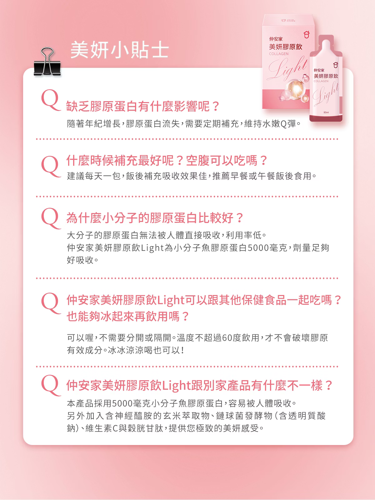 成分:水、膠原蛋白、蔗糖、蘋果濃縮汁、紅葡萄濃縮汁、檸檬酸、DL-蘋果酸、香料(含丙二醇、酒精、香料、水)、維生素 C、蔗糖素(甜味劑)、流行鏈球菌發酵物Streptococcus Zooepidemicus(含透明質酸鈉)、紅石榴萃取物(含紅石榴萃取物、麥芽糊精)、莓果萃取物(含麥芽糊精、巴西莓、蔓越莓、覆盆莓、 藍莓、石榴、草莓、西印度櫻桃、黑莓、山竹果、智利酒果、葡萄子、枸杞)、穀胱甘肽、玄米萃取物[含玉米糊精、米萃取物(含神經醯胺)]