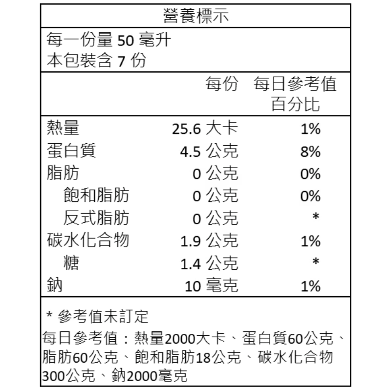 營養標示 每一份量50毫升 本包裝含7份 每份 每日參考值百分比 熱量 25.6大卡 1% 蛋白質 4.5公克 8% 脂肪 0公克 0% 飽和脂肪 0公克 0% 反式脂肪 0公克 * 碳水化合物 1.9公克 1% 糖 1.4公克 * 鈉 10毫克 1% *參考值未訂定 每日參考值:熱量2000大卡、蛋白質60公克、脂肪60公克、飽和脂肪18公克、碳水化合物300公克、鈉2000毫克