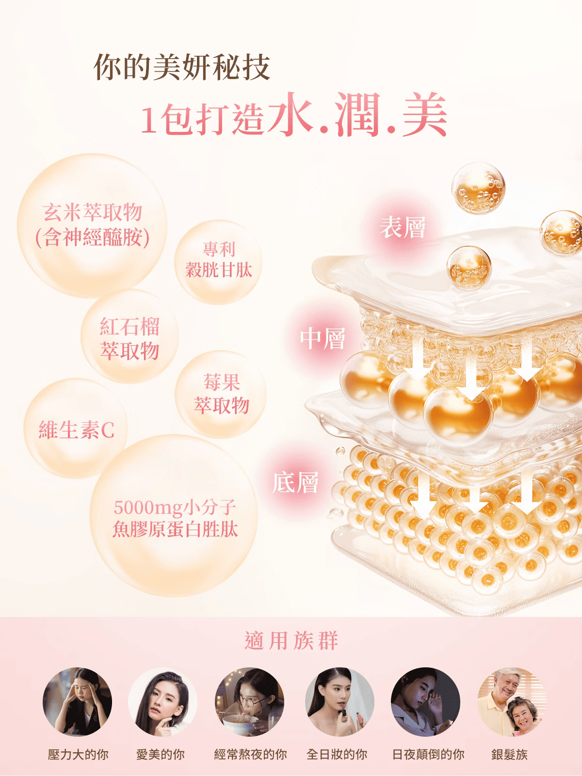 ⇨專利紅石榴、莓果萃取物、維生素C,自帶女神光芒