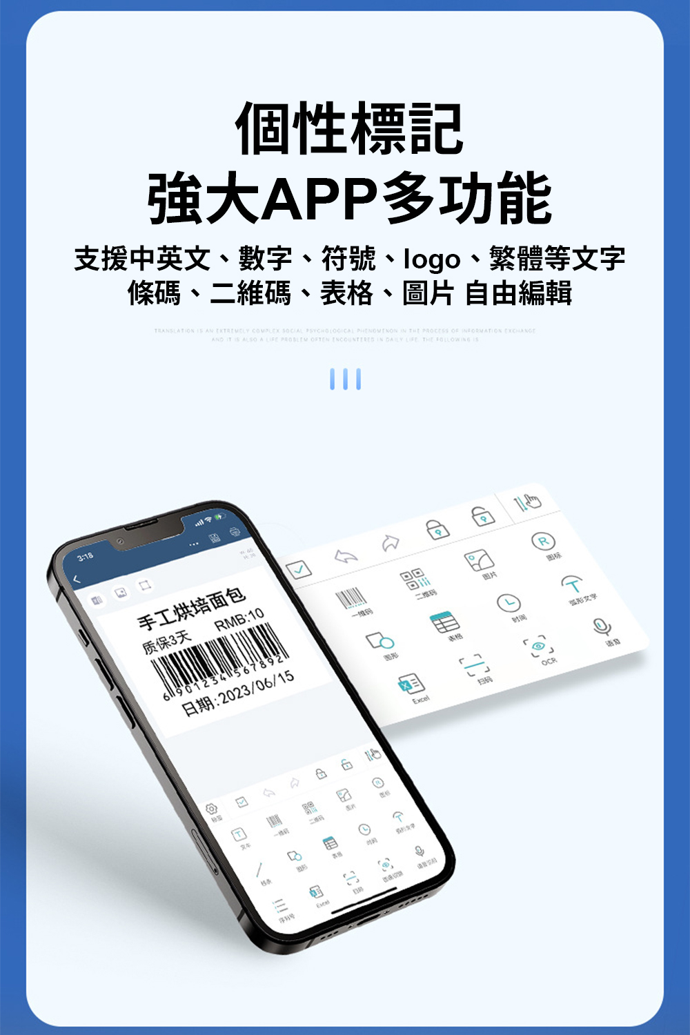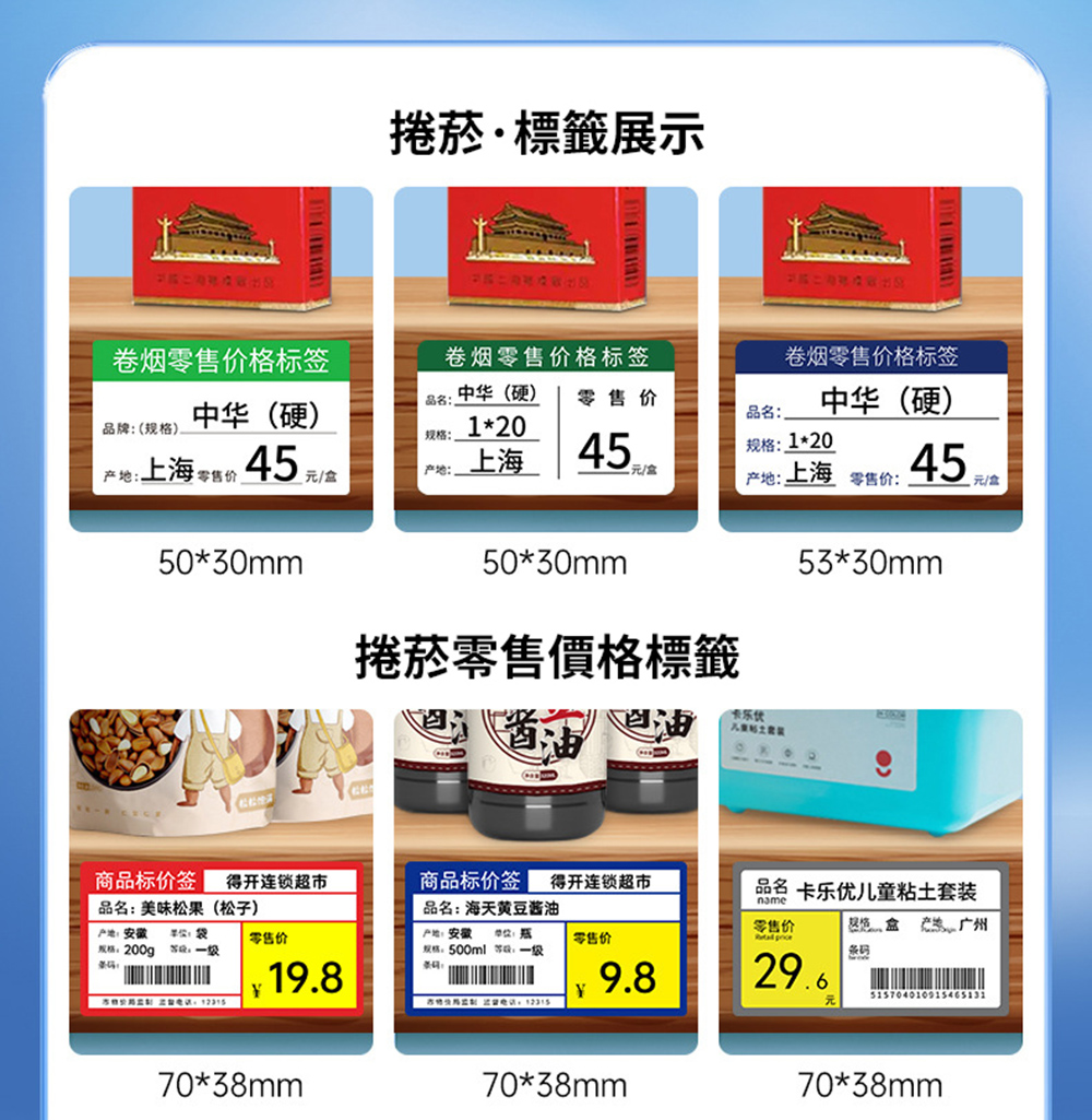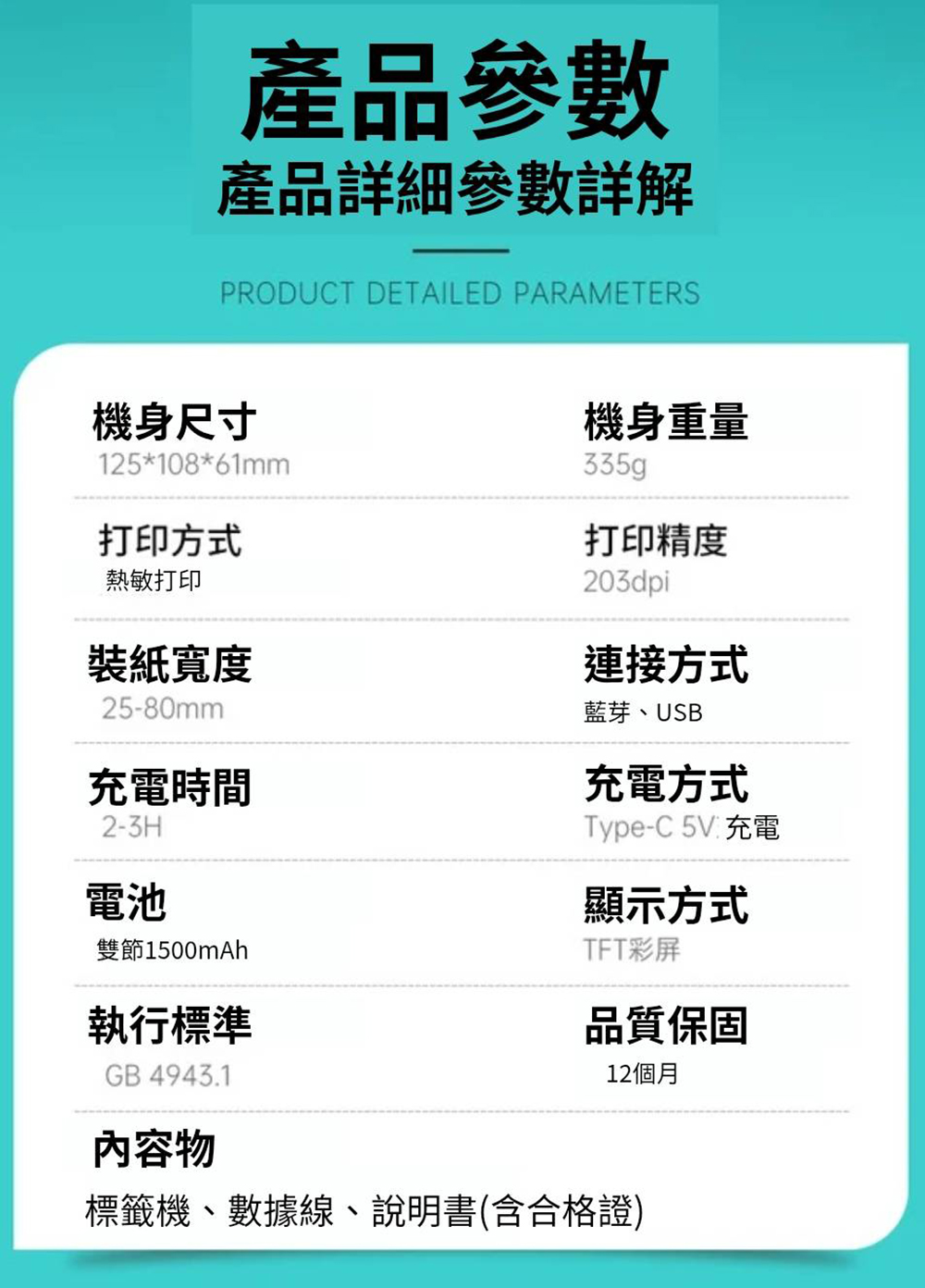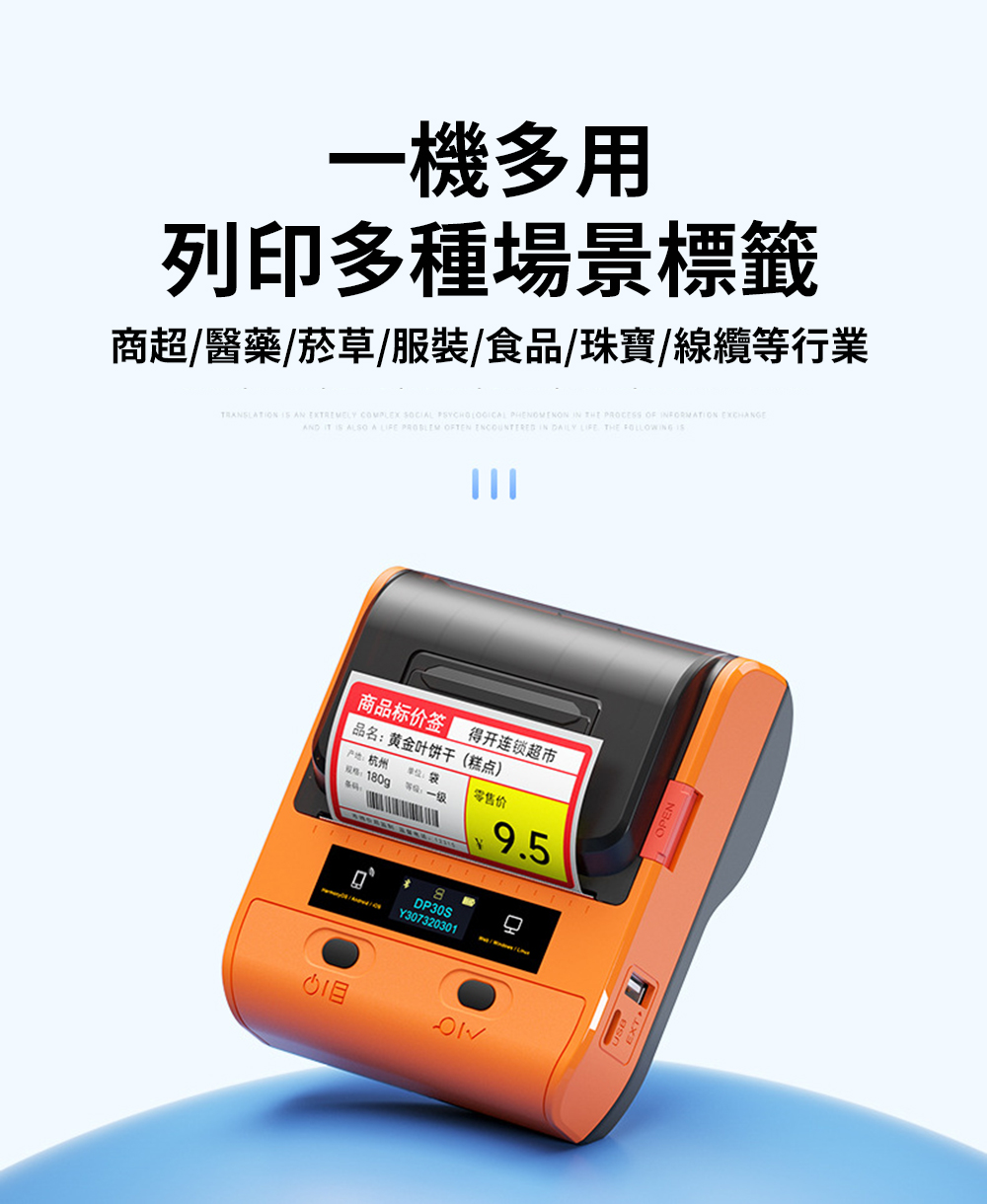 【德佟DETONGER】DP30S(203DPI) 多功能藍芽標籤機 熱感應標籤機 貼紙機 送硬殼包列印方式: 熱感應尺寸:125*108*61mm(長x高)重量:335g裝紙寬度:25-80mm充電方式:Type-C 5V充電通訊方式:藍牙、USBNCC:CCAH24LPE331T7BSMI:R46620德佟原廠貼紙特點:防撕、防水、防油、防刮無雙酚A檢測通過商檢檢驗檢驗合格證書號碼:20203404126-00-6備註 : 不要使用快充頭充電,以免造成損壞
