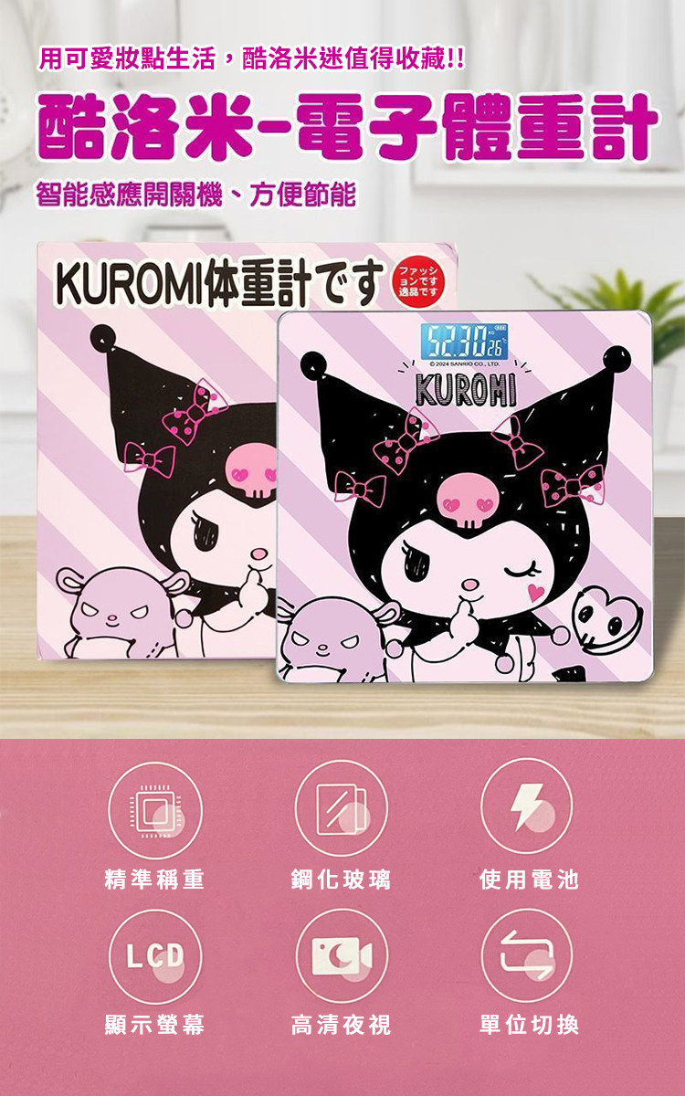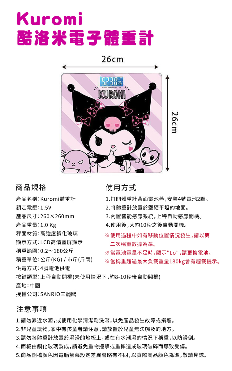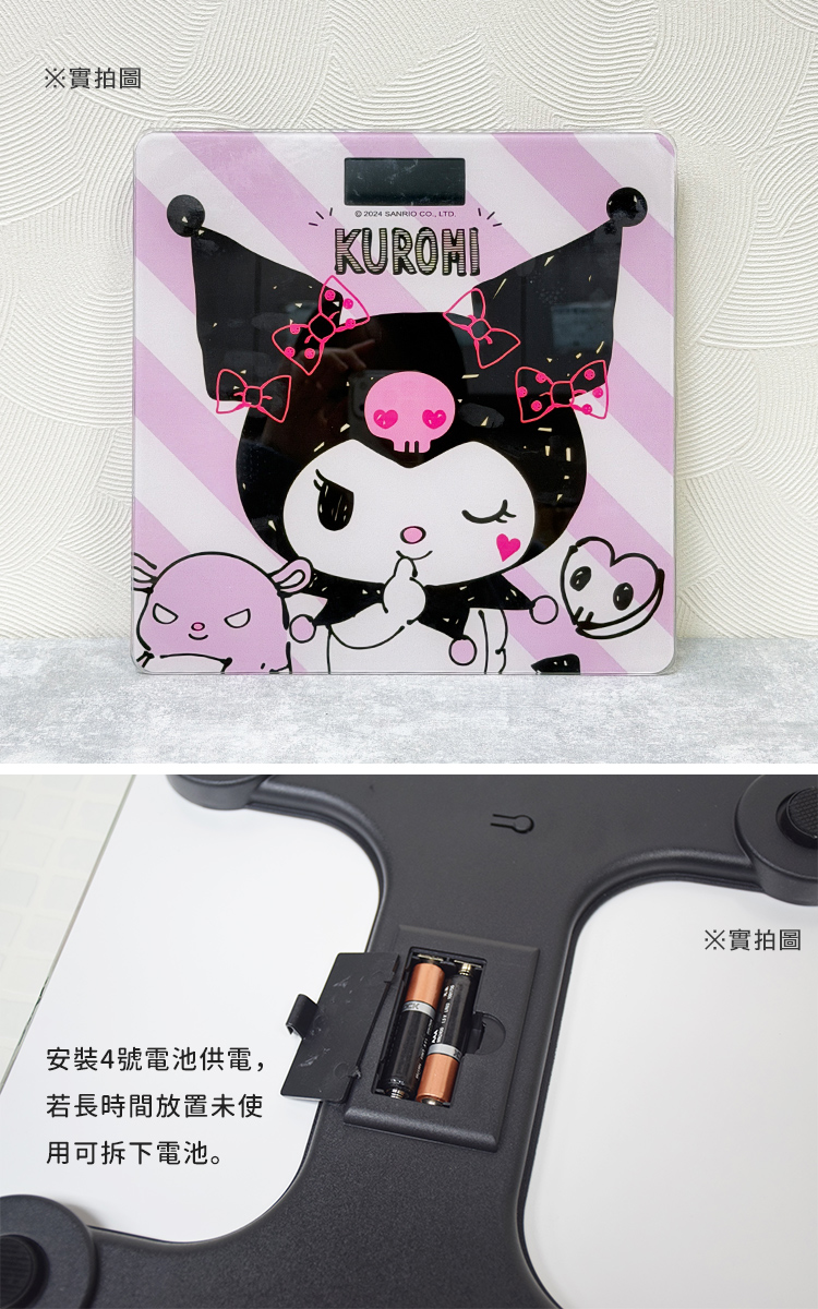 ●三麗鷗正版授權,卡哇伊●四邊安全圓角設計,防止磕傷肌膚●高強度鋼化玻璃,LCD顯示螢幕●智能感應設計,精準稱重●送禮自用兩相宜●使用4號電池2顆供電(未附)