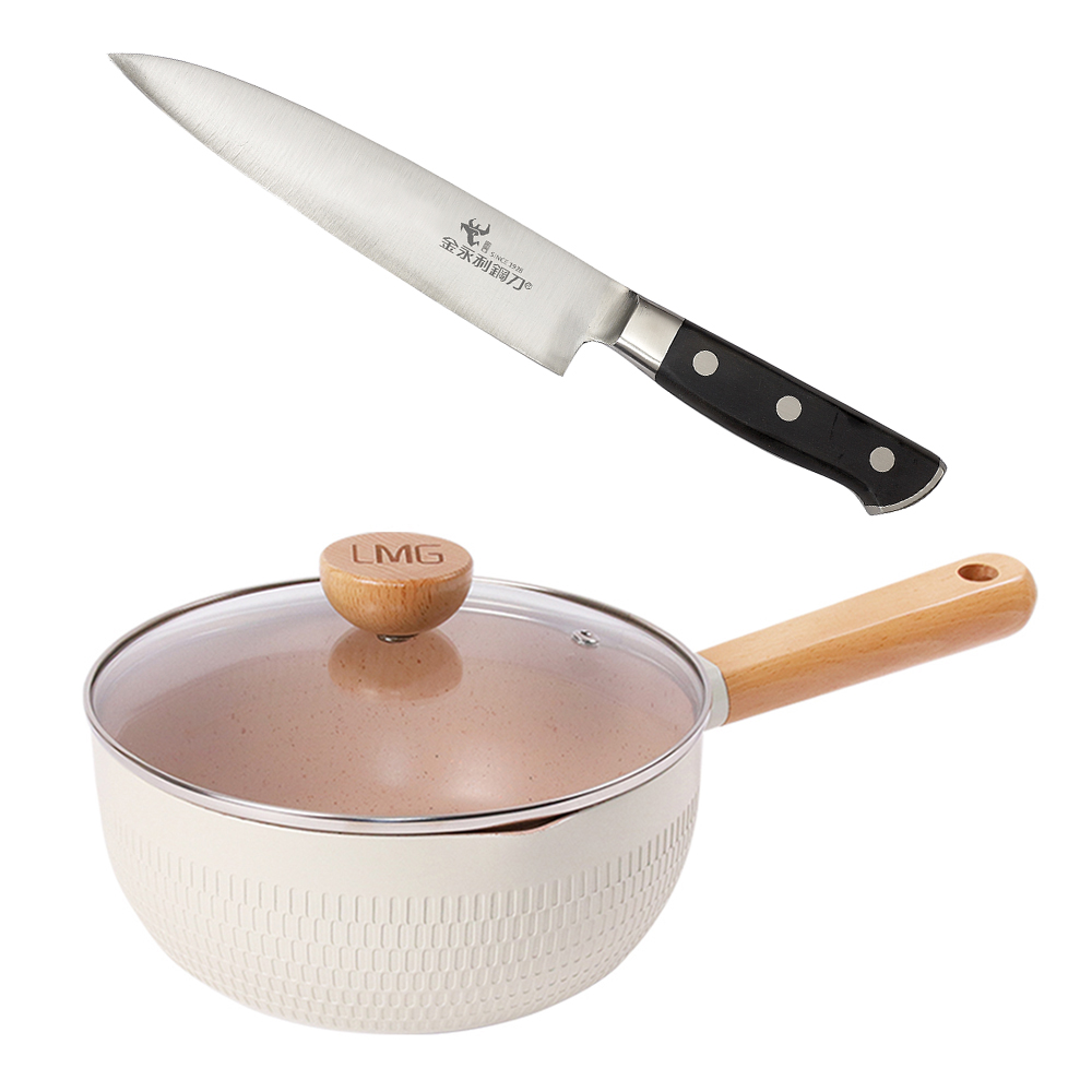 【金永利鋼刀】電木系列尖水果刀15cm(E3)+LMG錘紋不沾雪平鍋/附蓋 22cm