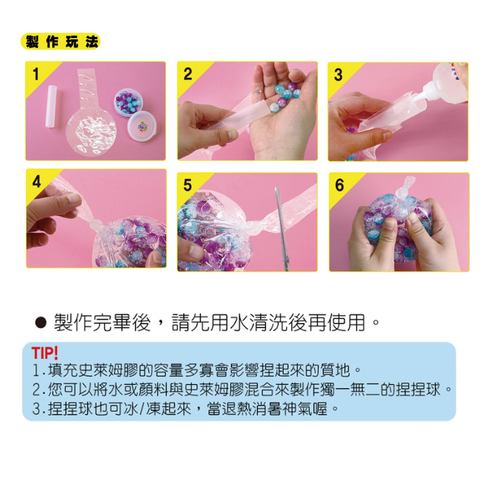 產品名稱:史萊姆創意捏捏球-小粉晶☆容物:1個捏捏球體+1個透明注入管+120ML透明史萊姆膠+水晶體生產國:韓國使用年齡:3歲以上生產日期:依盒上標示 保存期限:5年製造商名稱:AmosCo.,Ltd.容量:120mlBSMI商品檢驗標識字號: 標檢局印製 UC2 8147601~8149088使用注意事項&警告打開產品前請務必閱讀注意事項。·患有過敏、特殊體質或疾病的兒意需要監農人的特別關注。使用後必須洗手。·8歲以下兒童必須在成人監護下使用,使用後請將其放在不易觸及的地方。·小心兒童可能吞嚥(窒息、呼吸困難)。·請勿向人或動物投擲。請勿將其放入口中或吸吮。·請勿用於預期目的以外的用途。遠離火源··若吞嚥,請喝水並立即專家。·小心不要讓它黏在衣服、地毯或頭髮上。·若沾到地毯或衣服上,請用溫水浸泡溶解,然後清洗。·使用後請業務必蓋上產品的蓋子,以免產品變乾或被污染。·小心不要被外殼邊邊緣刺穿或割傷。·務必由監護人進行拆卸和組裝,以清除異物。·水晶史萊姆是消耗品,不能半永久使用。·此只盒不用於不存放,因此取出產品后將其丟棄。·請小心使用,因為水氣球可能會破裂。·該玩具含有可能造成窒息危險的珠子。·不適合3歲以下兒童童使用。